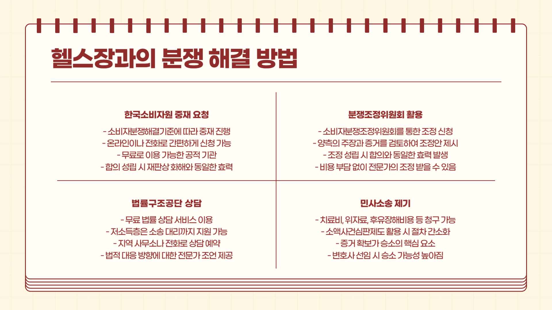 헬스장과 원만한 합의가 어려운 경우에는 외부 기관을 통해 중재를 요청할 수 있습니다.