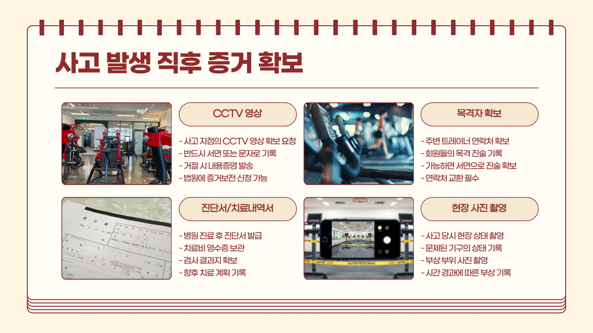 - 목격자 확보: 주변 트레이너나 회원들의 진술도 큰 도움이 됩니다. 가능한 한 연락처와 진술을 확보하세요.