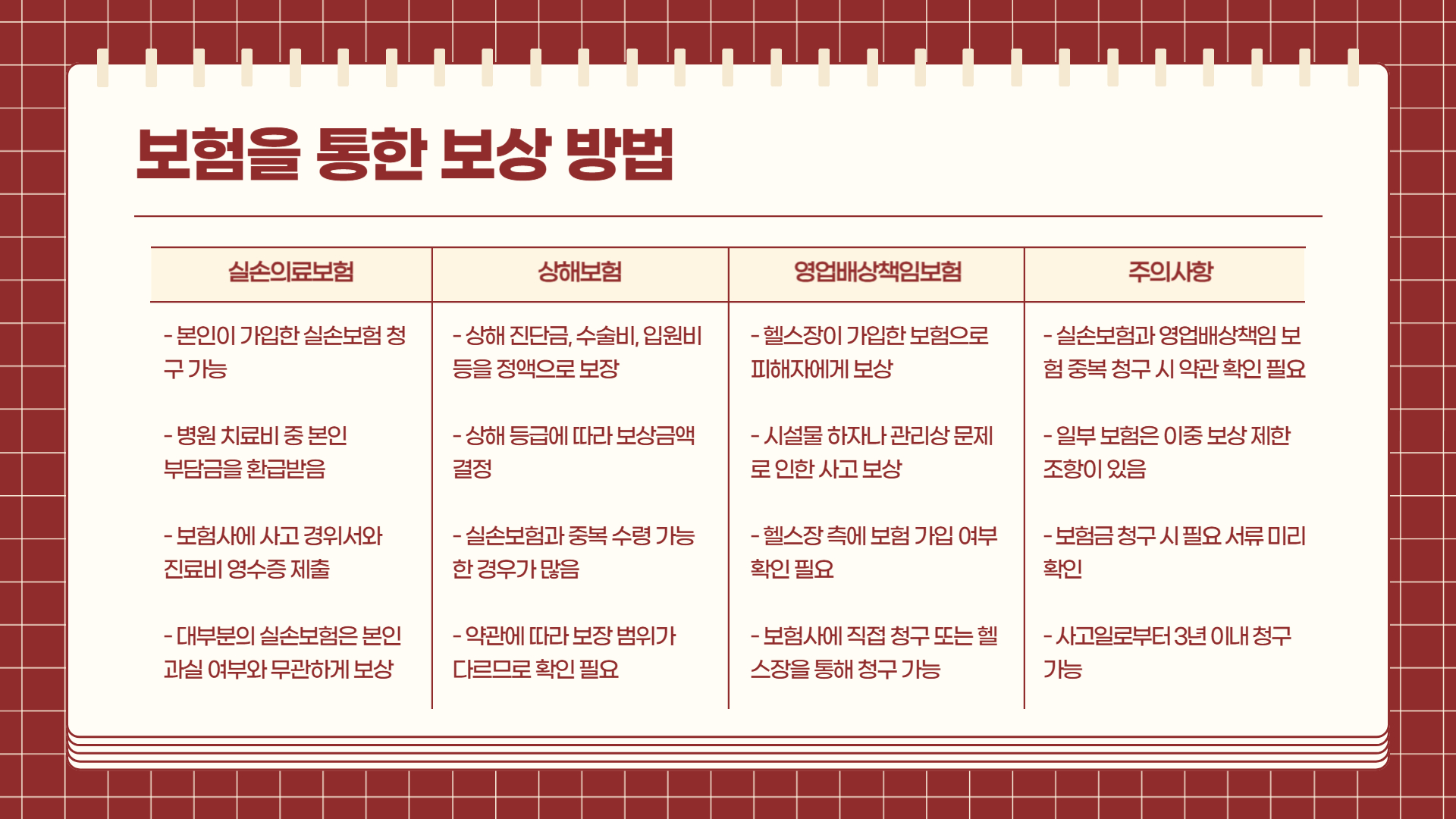 헬스장에서 사고가 발생했을 때는 본인의 보험과 헬스장이 가입한 보험을 통해 보상을 받을 수 있습니다.