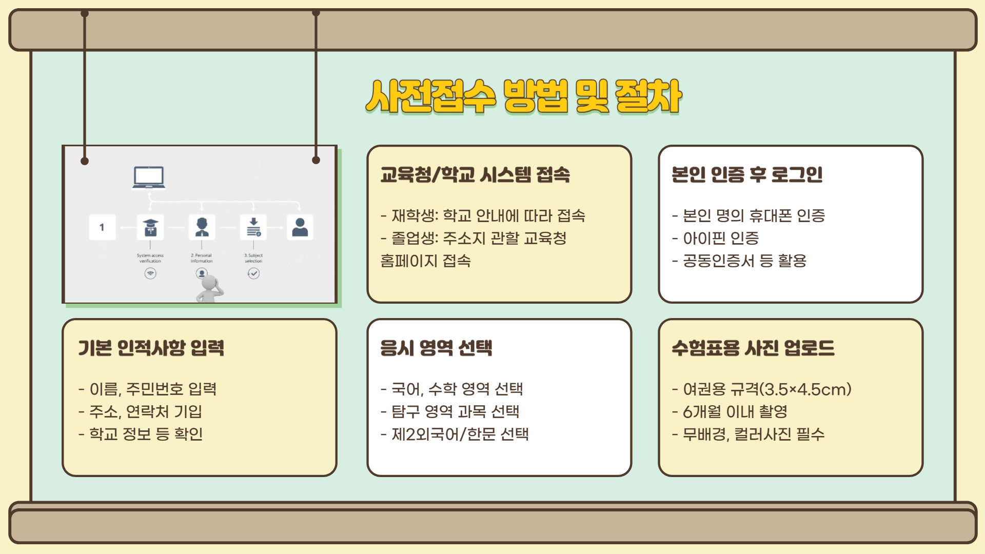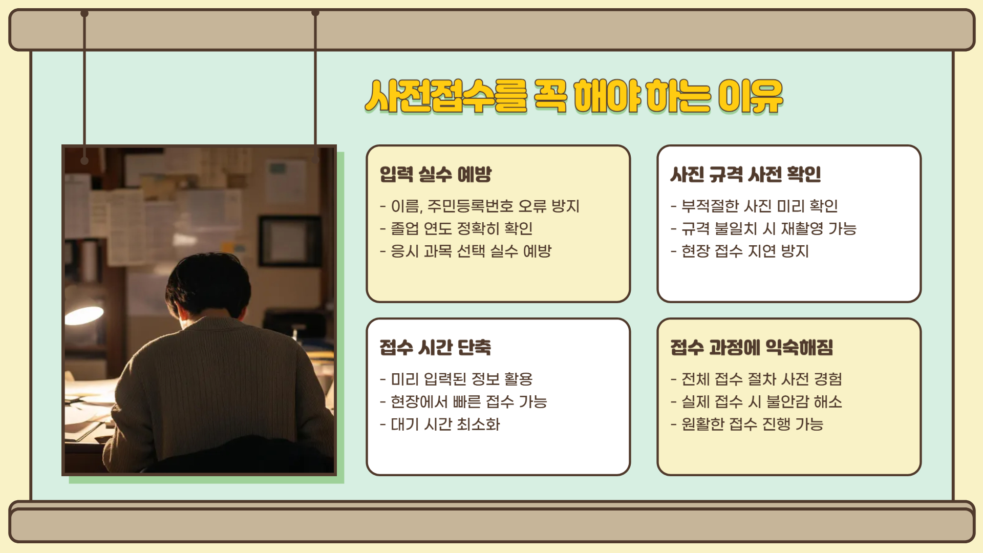 수능 원서 사전접수는 정식 접수에 앞서 온라인으로 본인의 인적사항, 응시 영역, 사진 등을 미리 입력해 두는 절차입니다. 이 사전입력은 정식 접수와 같은 법적 효력은 없지만, 입력 오류를 사전에 확인하고 실제 접수 시 걸리는 시간을 대폭 줄일 수 있다는 점에서 매우 유용합니다.