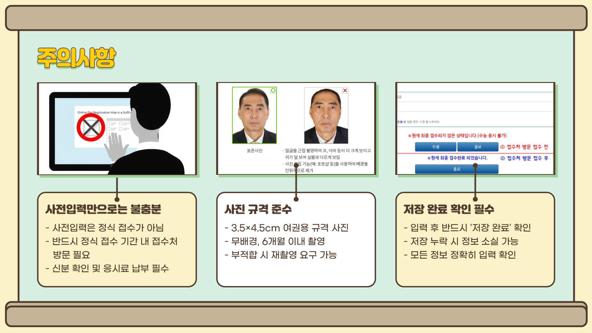 | 필수 체크 | 정식 접수 완료 여부, 사진 규격, 저장 확인 |