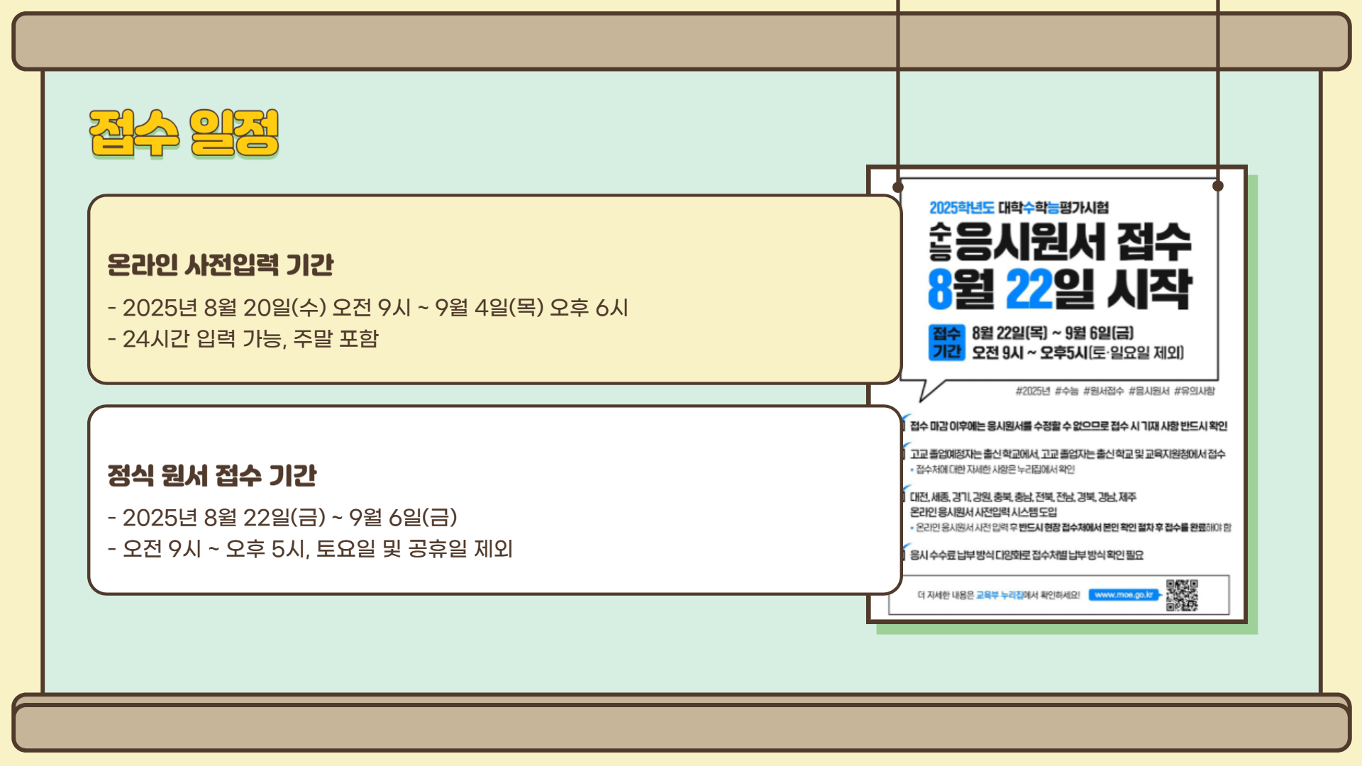 수험생에게 있어 수능 원서 접수는 단순한 행정 절차를 넘어, 대학 입시 전체를 좌우하는 중요한 시작점입니다. 특히 2025학년도 수능부터는 온라인 사전입력 제도가 확대되며 많은 수험생들이 이를 통해 원서 작성 실수를 줄이고, 접수 기간의 혼잡도 완화할 수 있게 되었습니다. 이번 포스팅에서는 수능 원서 사전접수의 개념, 일정, 방법, 주의사항, 그리고 자주 묻는 질문까지 상세히 안내드립니다.
