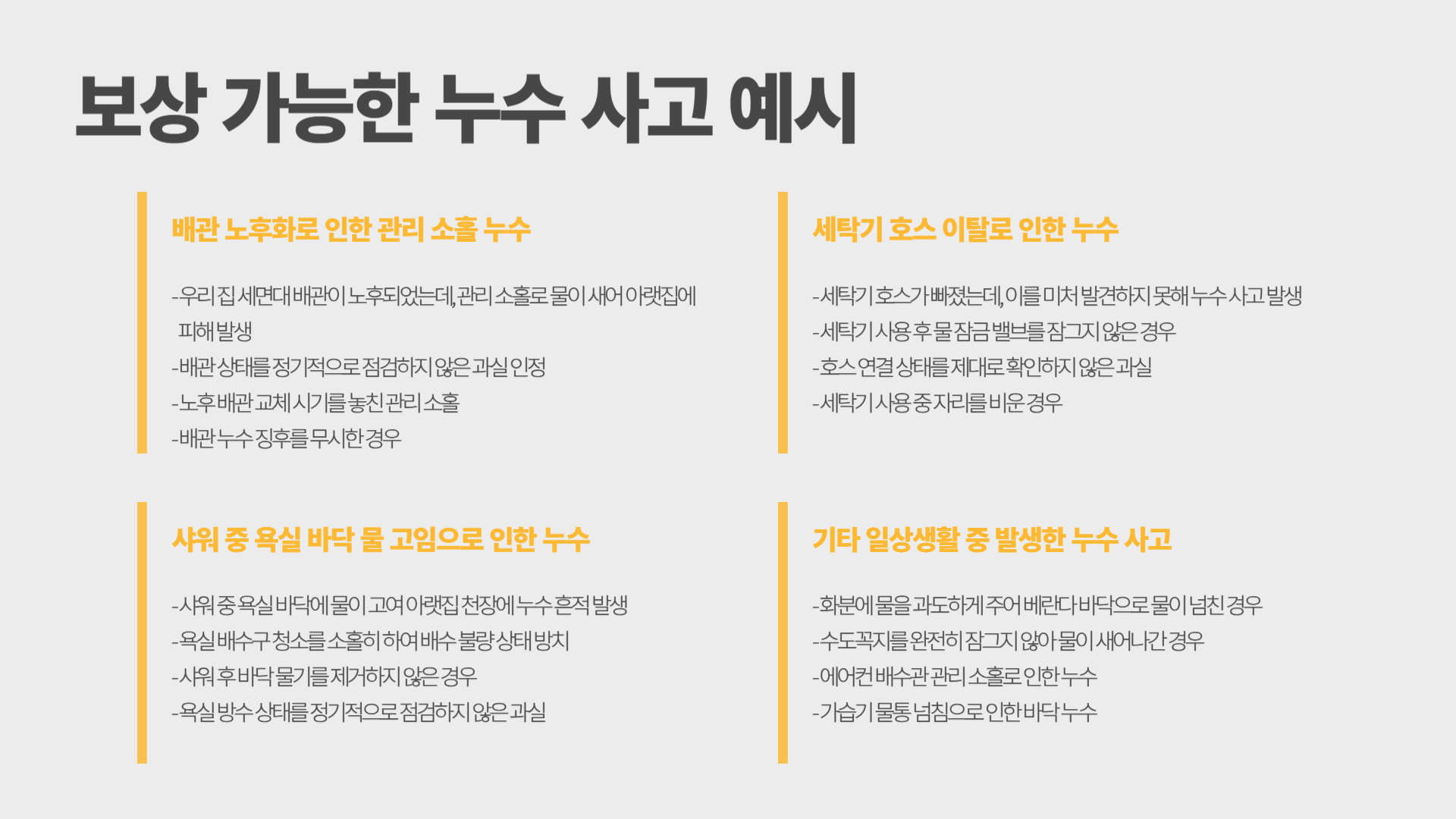 따라서 누수 사고가 ‘과실에 의한 것’이어야 보상 대상이 됩니다.