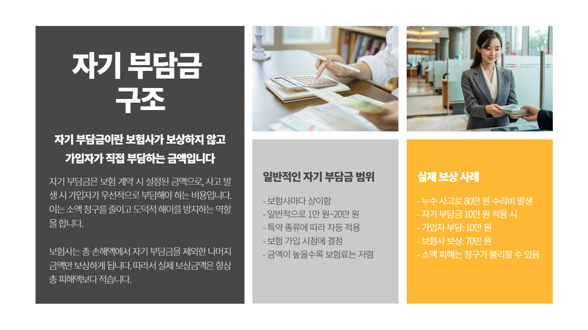 보험사에서 손해를 전액 보상해 주는 것이 아니라, 일부 금액은 가입자가 부담해야 합니다. 이를 자기 부담금이라고 합니다.