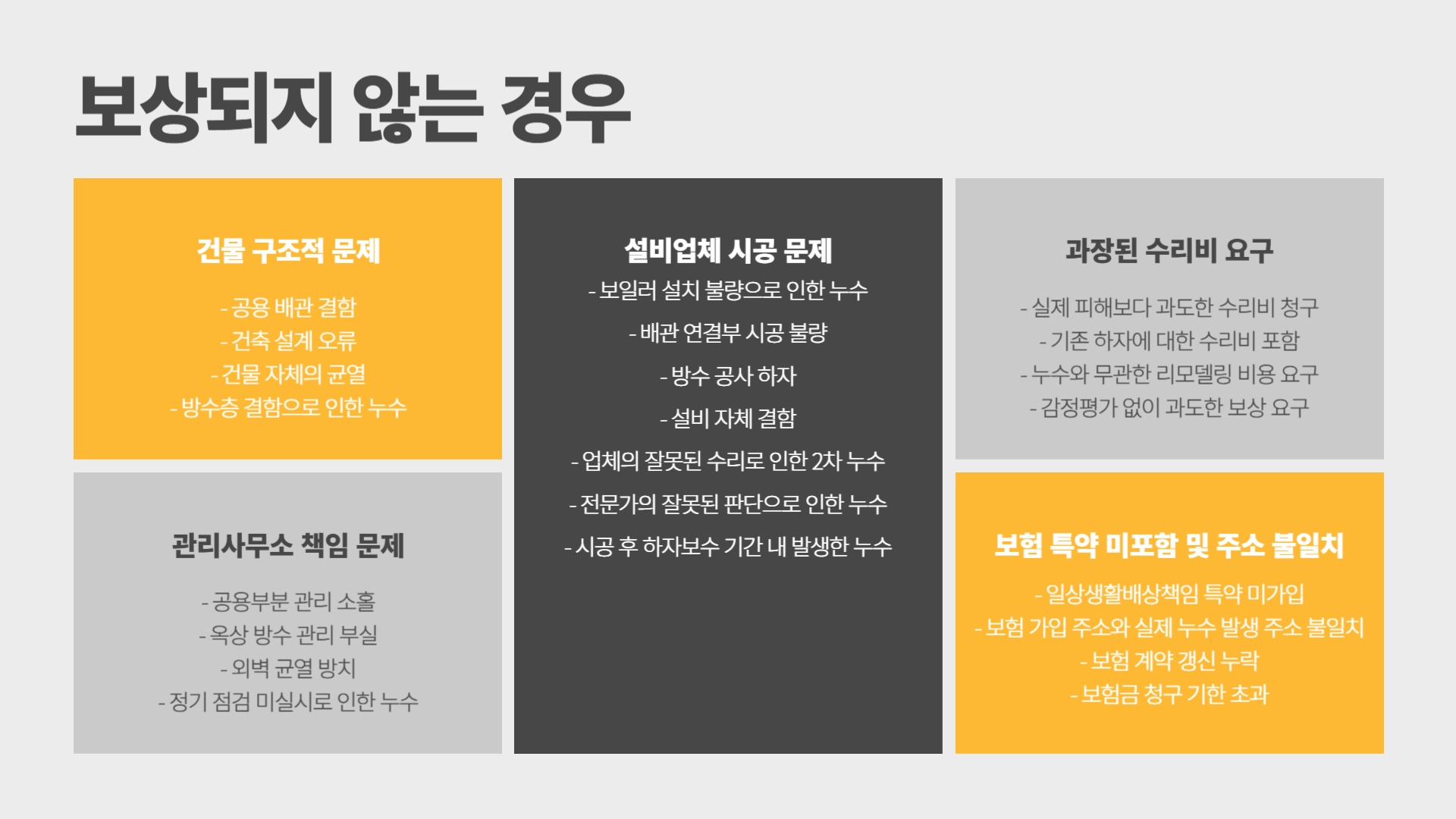 - 누수 원인이 건물 구조적 문제(공용 배관, 건축 결함)인 경우