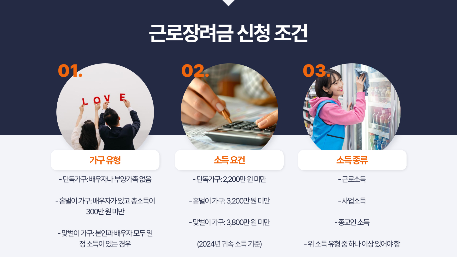 근로장려금을 받기 위해서는 다음 세 가지 요건을 모두 충족해야 합니다.