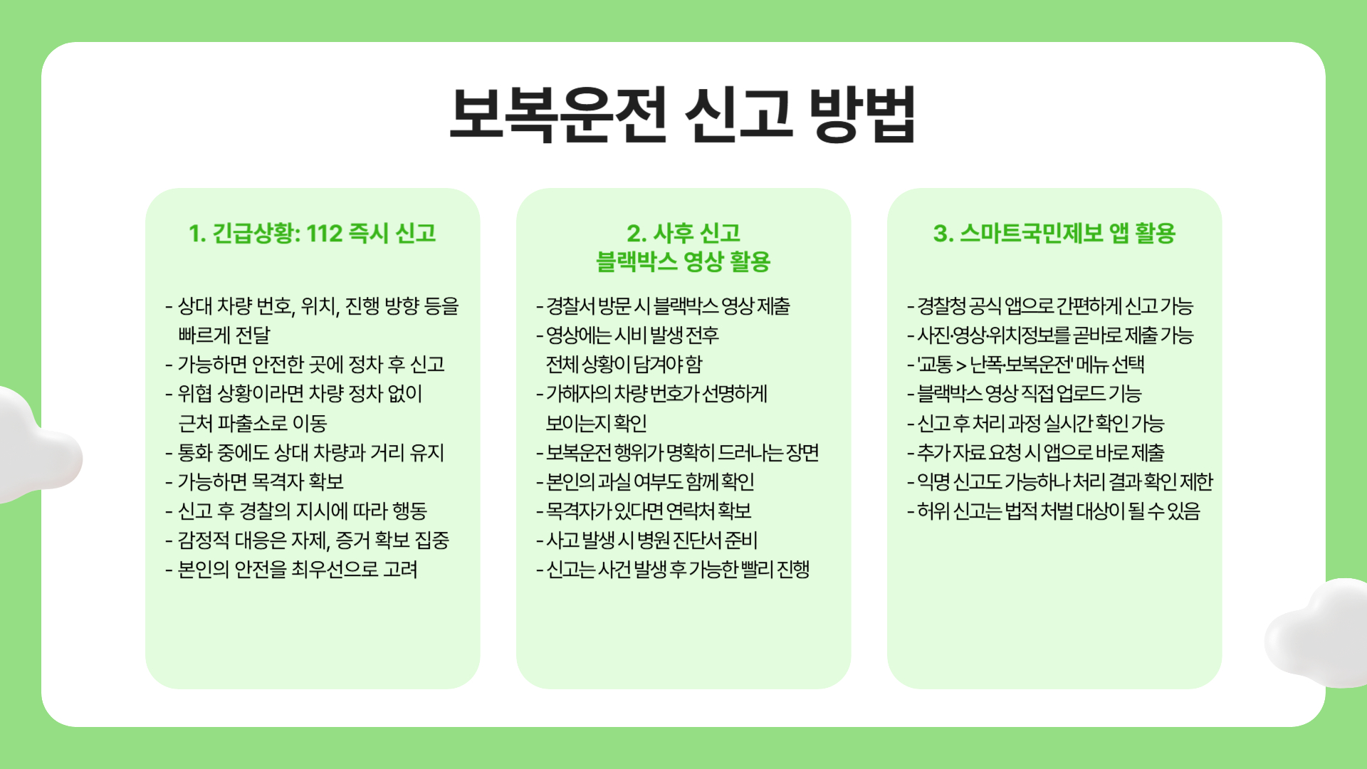 보복운전은 당사자가 직접 신고해야 처벌이 이루어지는 경우가 많습니다. 신고 시에는 객관적인 증거 확보가 중요하며, 다음과 같은 방법으로 대응할 수 있습니다.