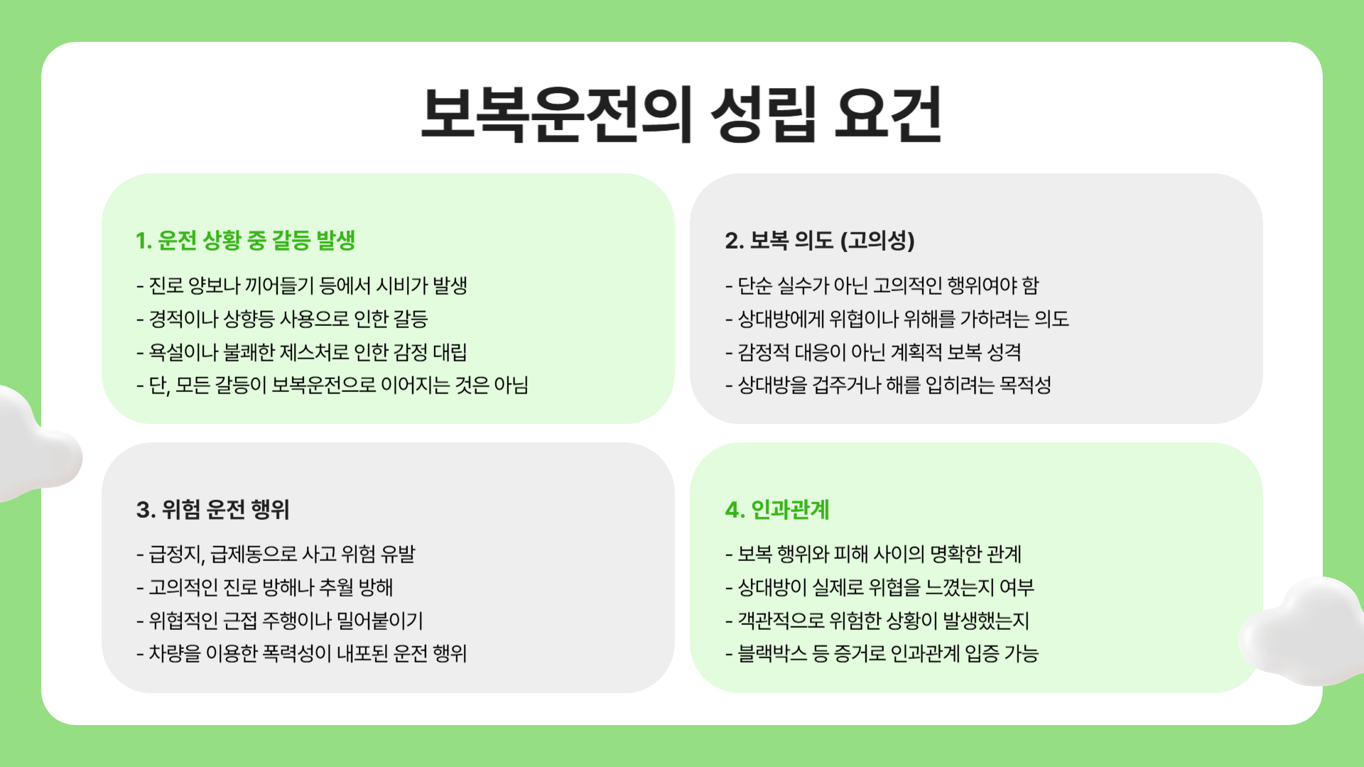 보복운전이 성립되기 위한 주요 요건은 다음과 같습니다: