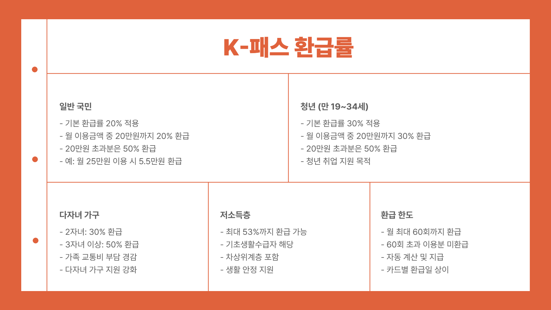K-패스는 교통비를 실질적으로 절감할 수 있는 제도로, 특히 월 15회 이상 대중교통을 이용하는 분이라면 반드시 신청해야 할 혜택입니다. 청년층, 다자녀 가구, 저소득층이라면 더욱 높은 환급율로 매달 수천 원에서 수만 원까지 돌려받을 수 있습니다.