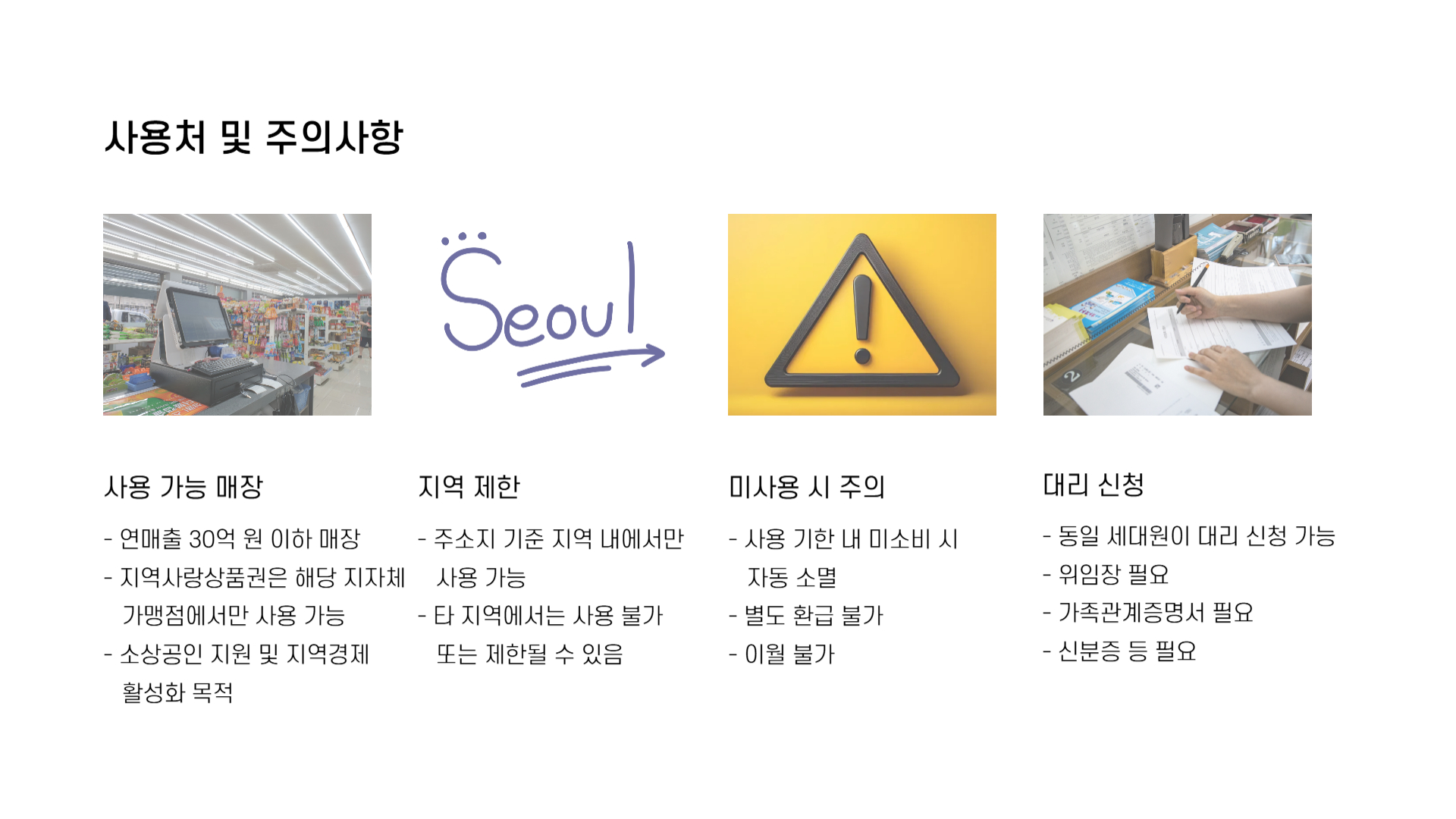 - 지역사랑상품권: 해당 지자체 가맹점에서만 사용 가능