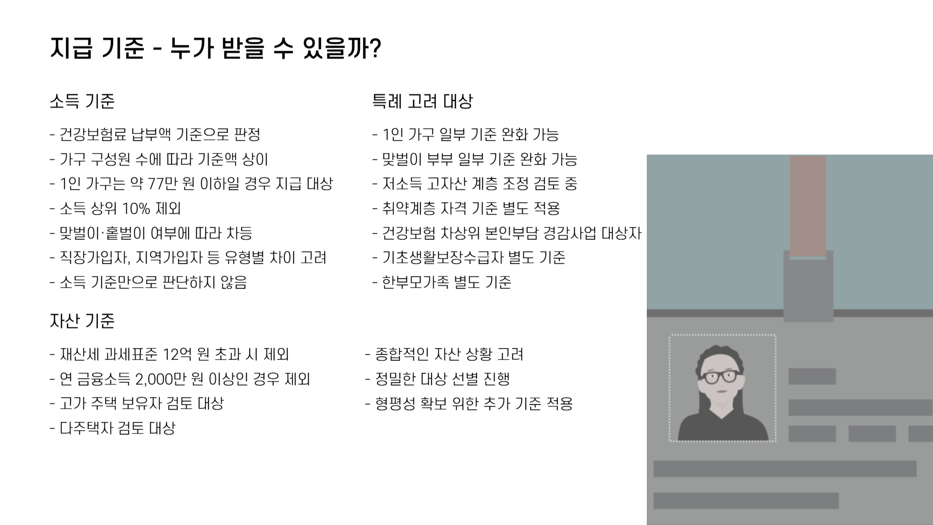 이처럼 단순 소득뿐 아니라, 종합적인 자산 상황까지 고려하는 구조로 개선되면서 보다 정밀한 대상 선별이 이루어질 예정입니다.