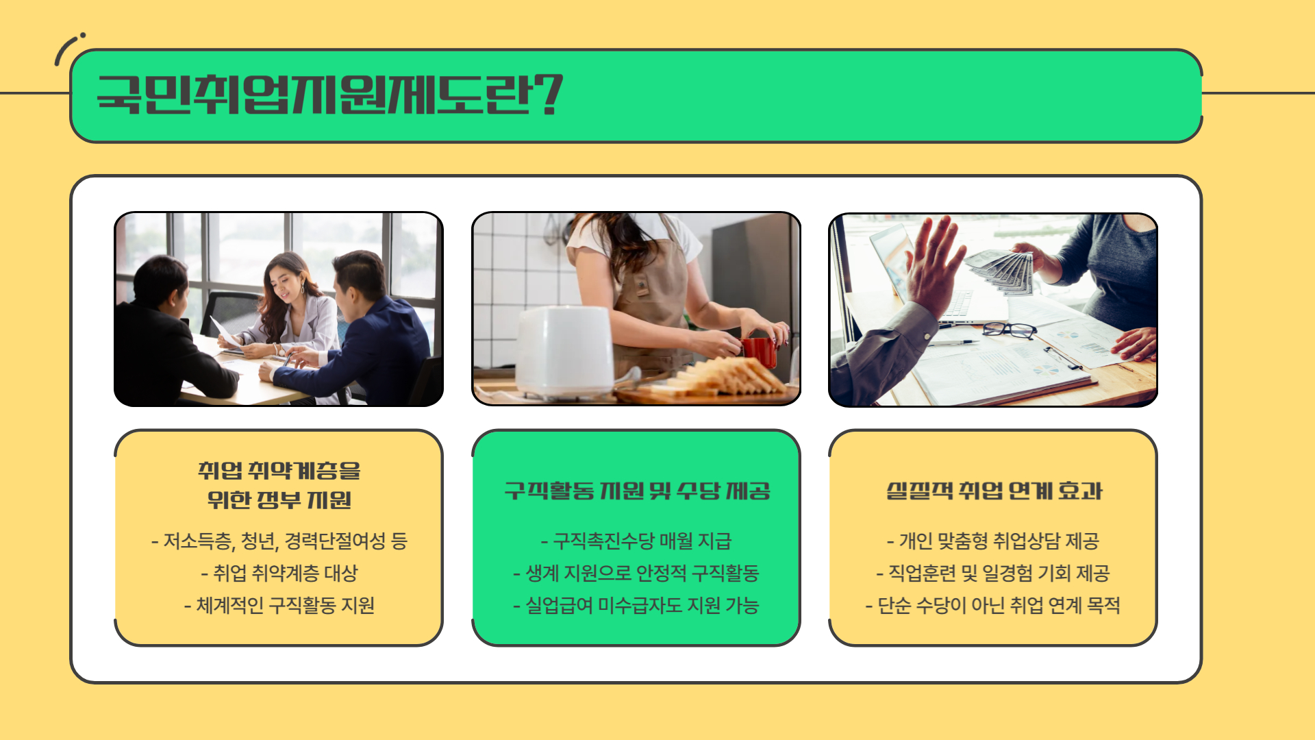 기존에는 실업급여를 받을 수 없었던 사람들도 이 제도를 통해 구직활동을 하면서 생계지원을 받을 수 있습니다. 단순히 수당만 주는 것이 아니라, 개인 맞춤형 취업상담, 직업훈련, 일경험 기회까지 함께 제공되어 실질적인 취업 연계 효과가 큰 것이 특징입니다.