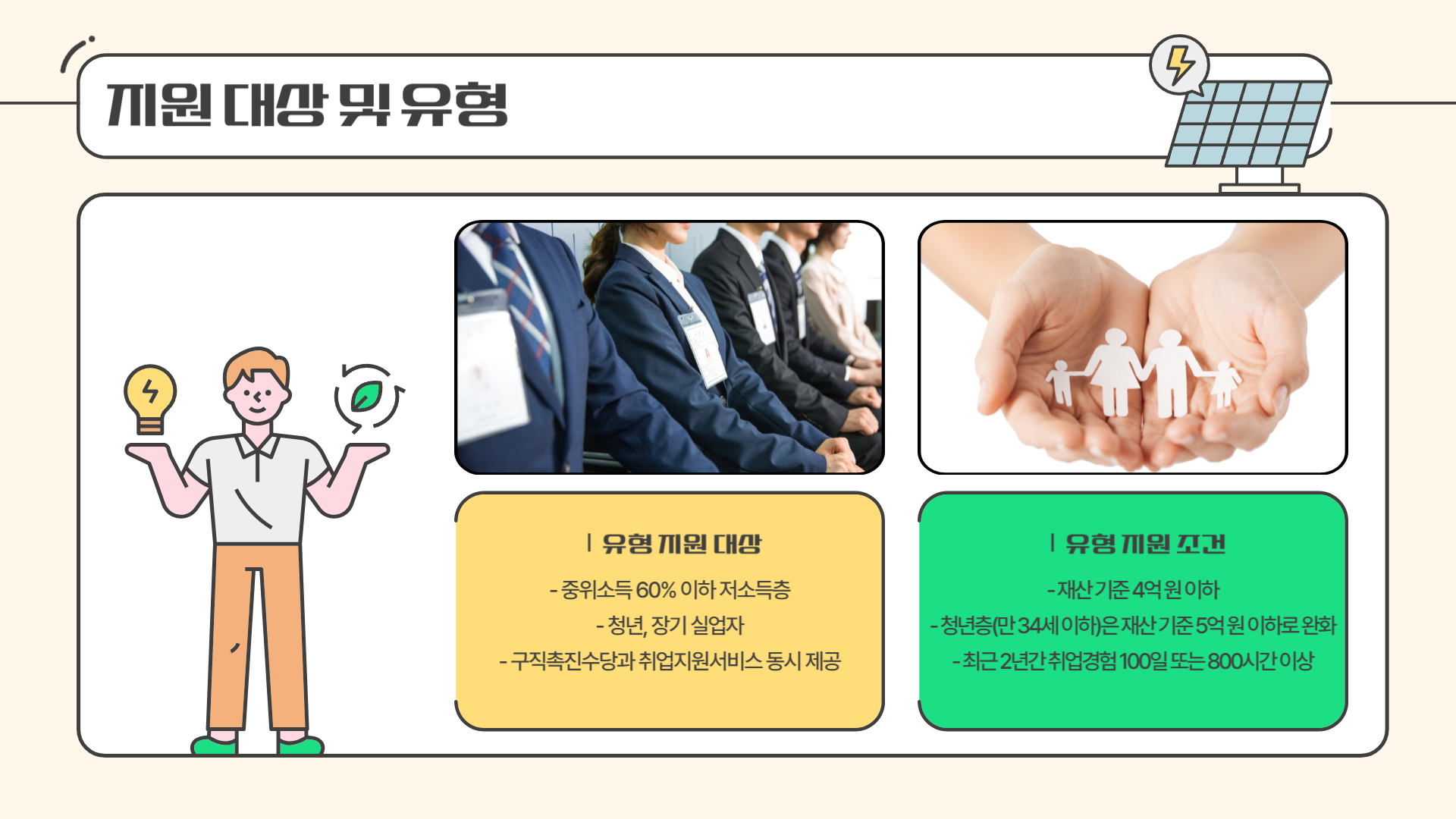 Ⅰ유형은 '구직촉진수당'과 '취업지원서비스'를 함께 제공하는 유형입니다. 중위소득 60% 이하의 저소득층, 청년, 장기 실업자 등이 해당됩니다. 재산 기준은 4억 원 이하이며, 청년은 일부 조건이 완화됩니다.