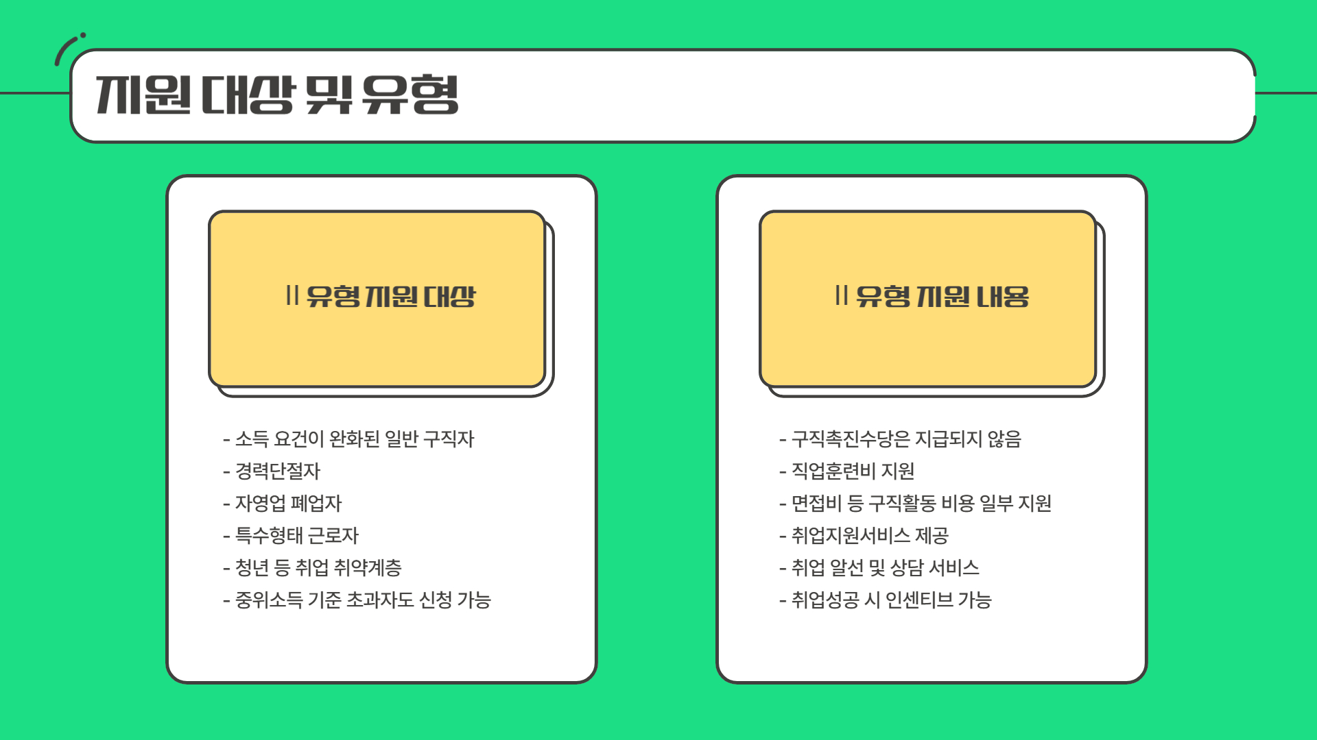 Ⅱ유형은 소득 요건이 완화된 대신 구직촉진수당은 지급되지 않고, 직업훈련비, 면접비 등 실질적인 구직활동 비용을 일부 지원받을 수 있습니다. 일반 구직자, 경력단절자, 자영업 폐업자, 특수형태 근로자 등도 대상이 될 수 있습니다.