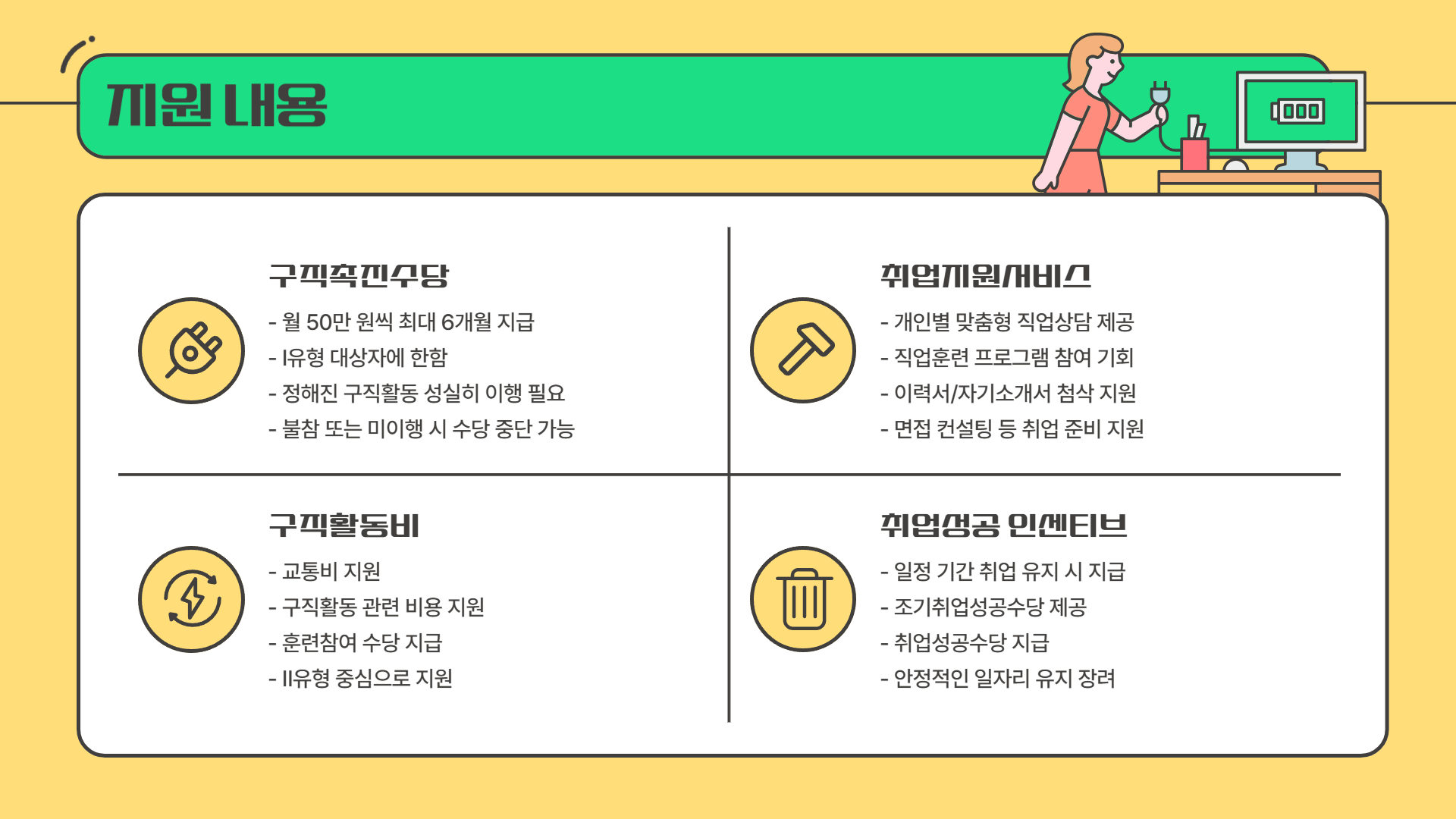 - 구직촉진수당: 월 50만 원씩 최대 6개월 지급. (Ⅰ유형 대상자에 한함)