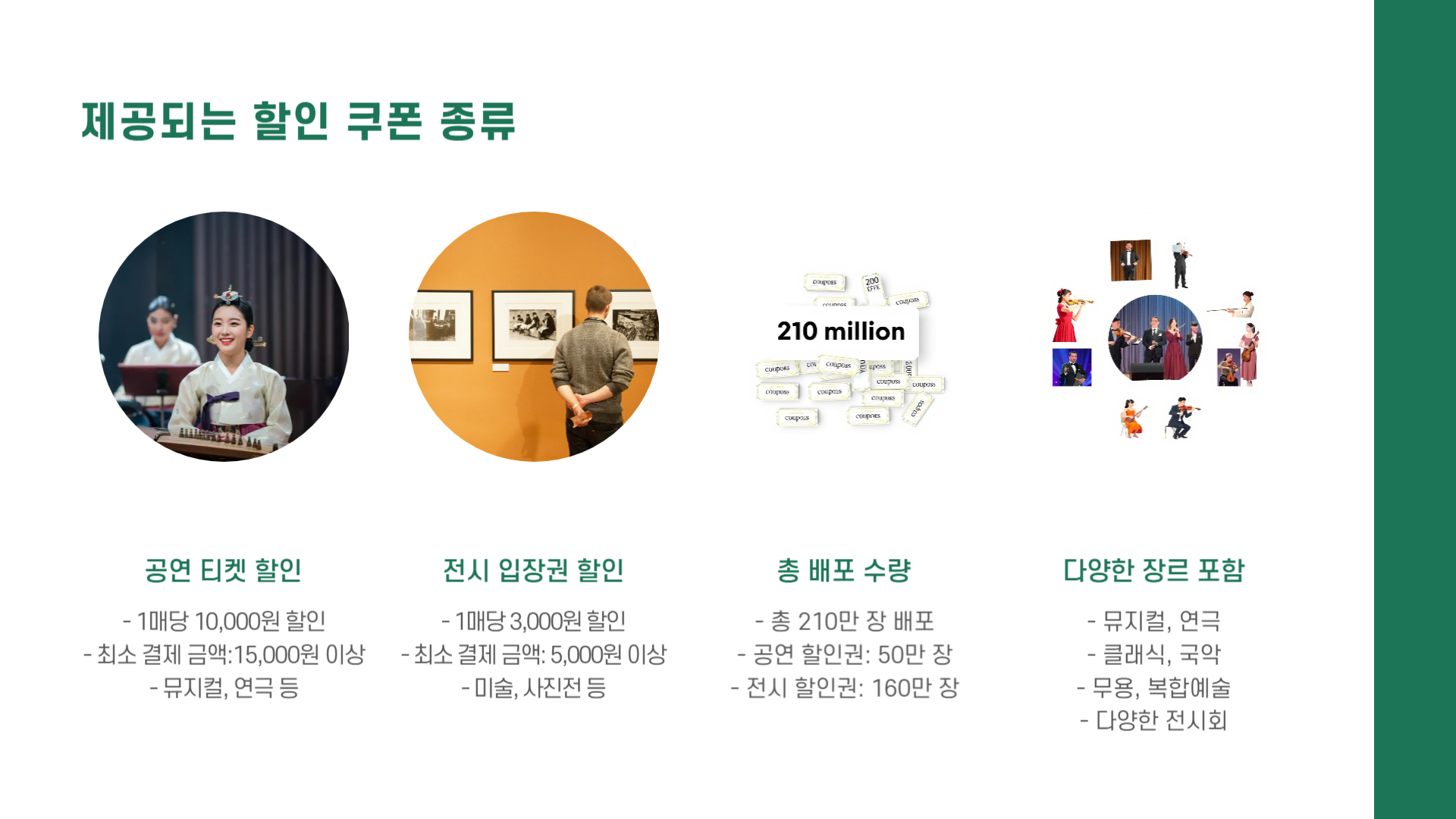 총 210만 장이 배포되며, 이 중 공연 할인권은 50만 장, 전시 할인권은 160만 장입니다. 특히 뮤지컬, 연극, 클래식, 국악 등 다양한 장르의 공연이 포함되어 있어 선택의 폭이 넓습니다.