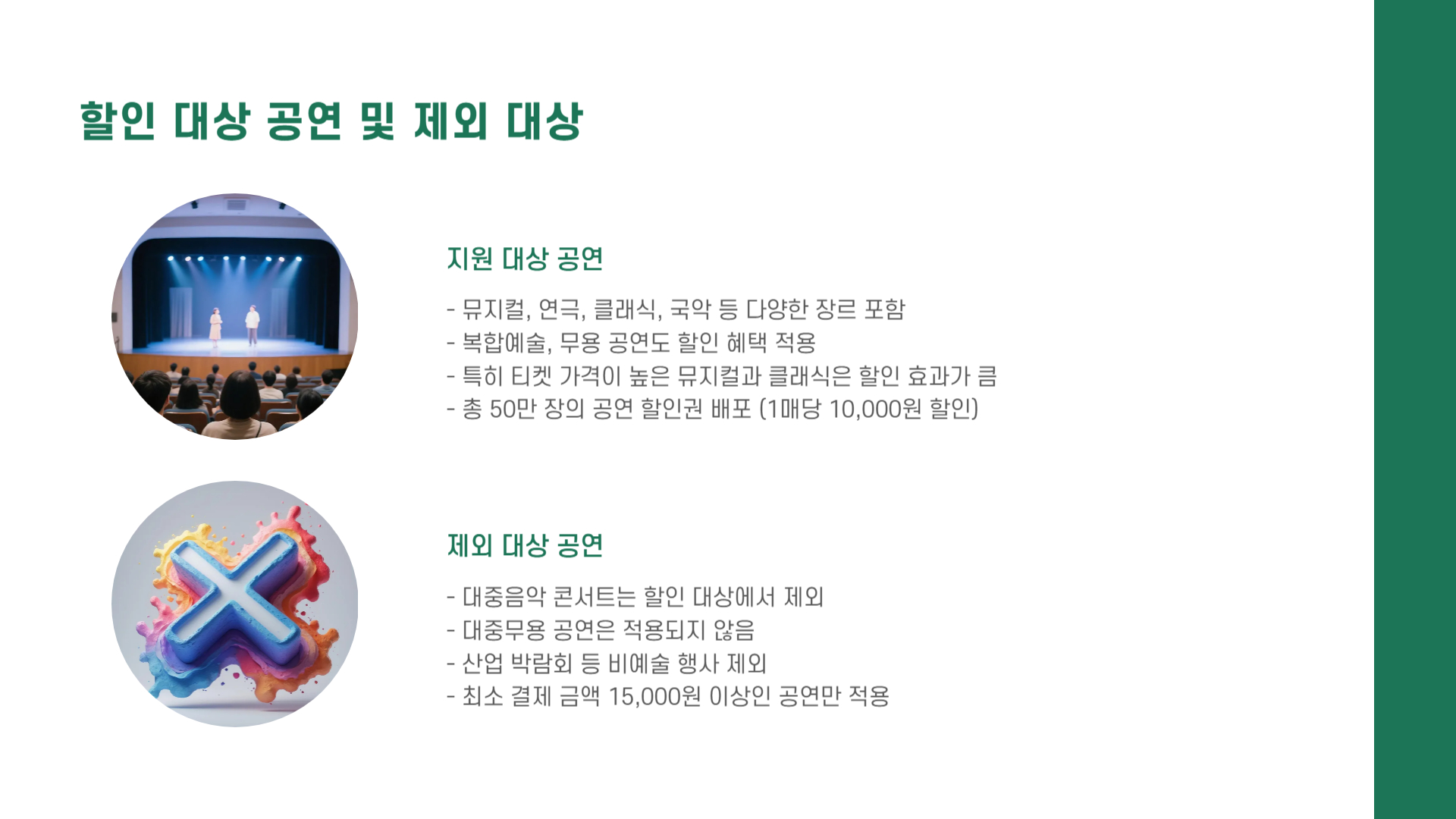 - 제외 대상: 대중음악 콘서트, 대중무용, 산업 박람회 등은 할인 대상에서 제외됩니다.