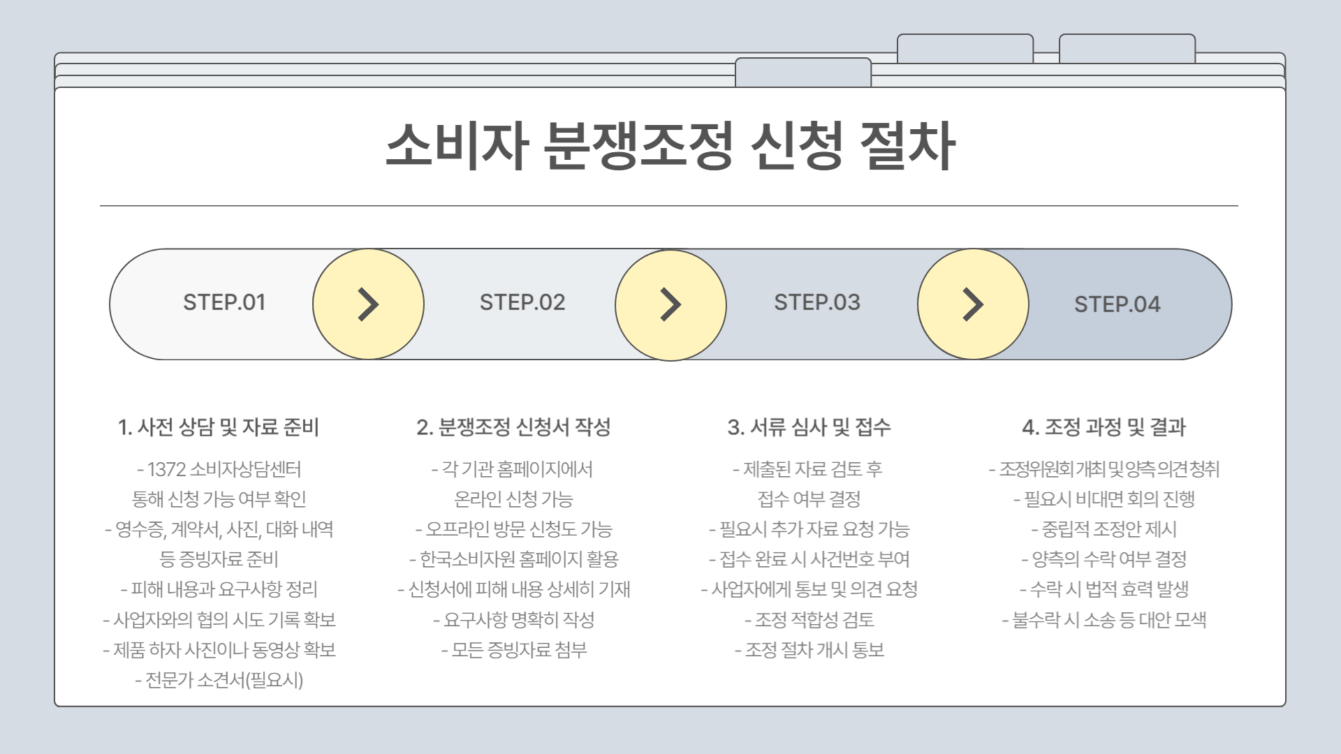 이 글에서는 소비자 분쟁조정이란 무엇인지부터 신청 절차, 필요 서류, 처리 기간, 그리고 실제로 신청할 때 유의해야 할 점까지 체계적으로 안내해 드립니다. 소비자 권리를 지키기 위한 첫걸음, 지금부터 함께 살펴보세요.
