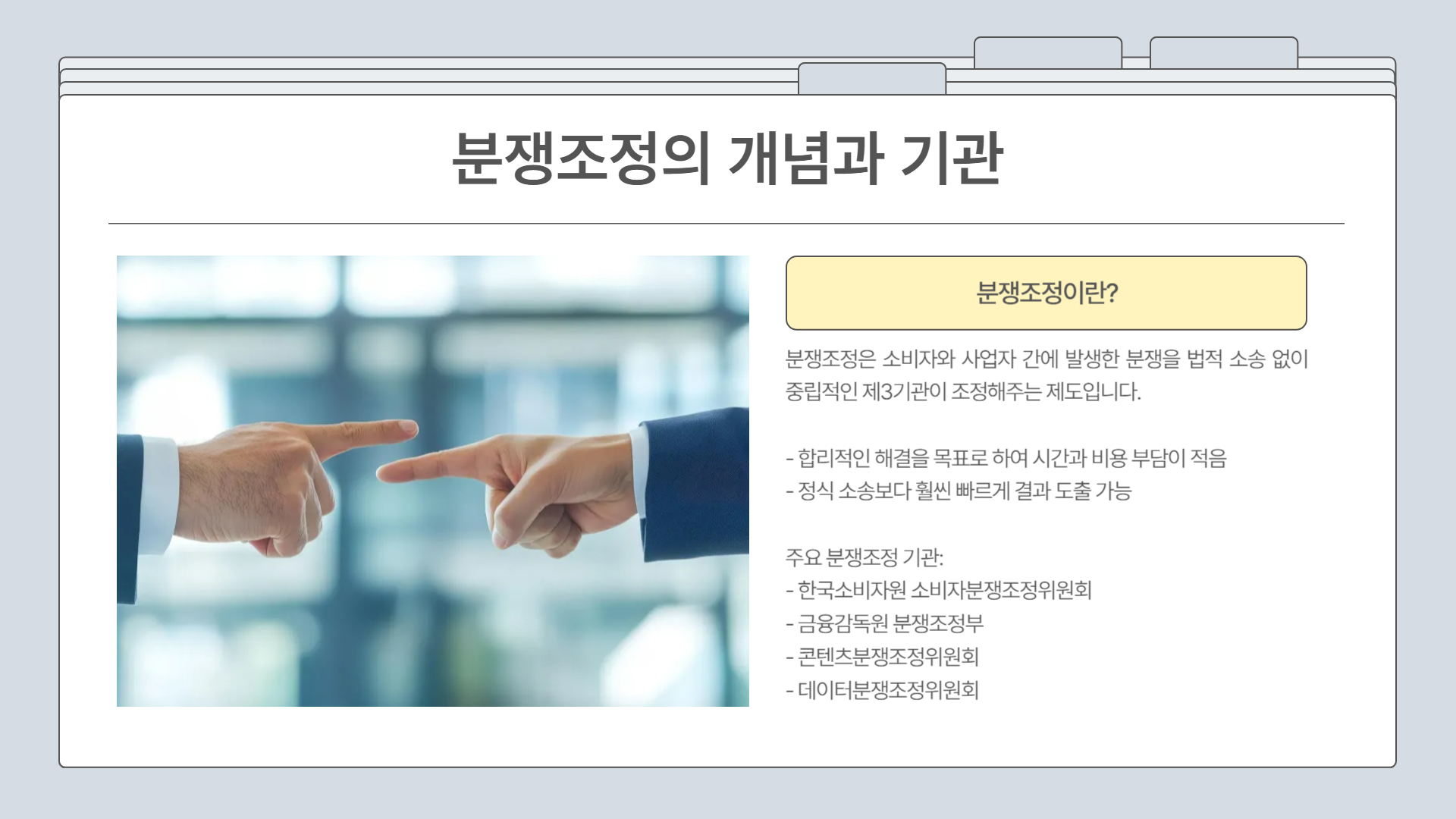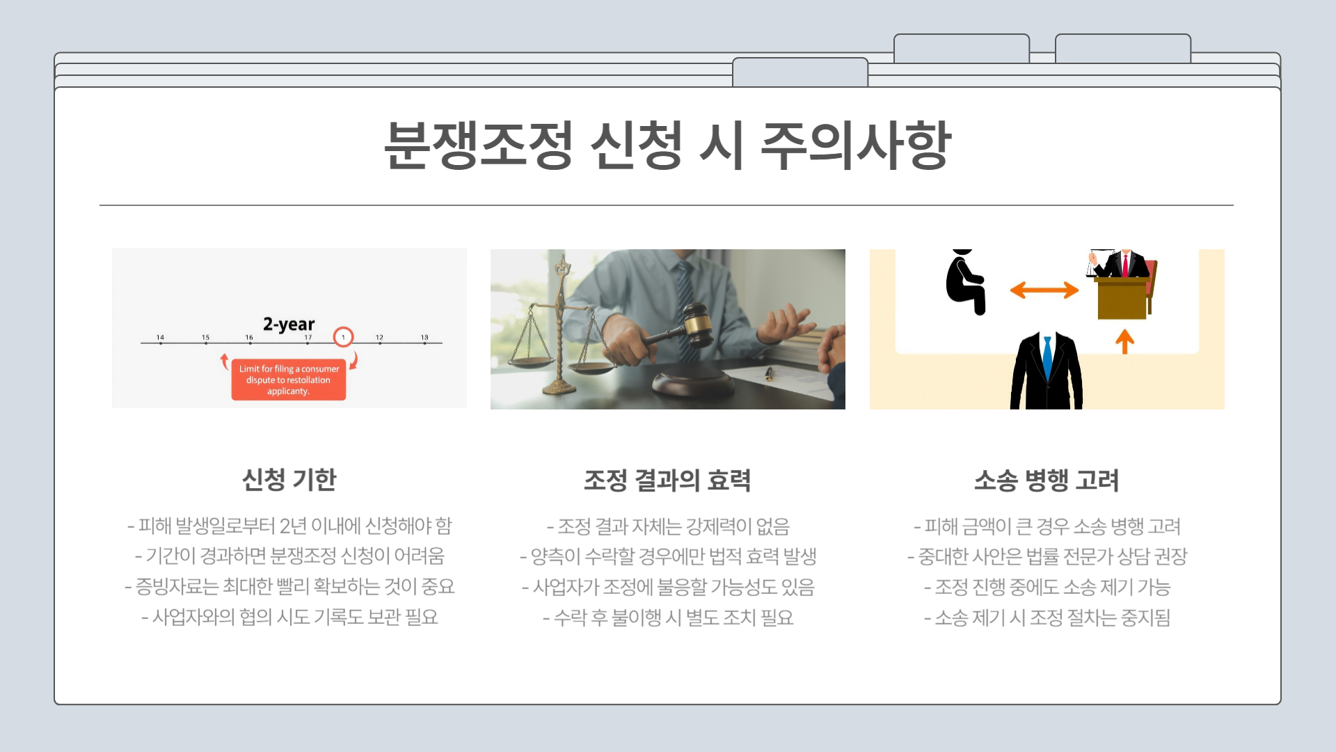 만약 사업자와의 갈등으로 불편을 겪고 있다면, 소송보다는 먼저 분쟁조정을 고려해 보세요. 피해를 예방하고 문제를 원만하게 해결할 수 있는 똑똑한 선택이 될 수 있습니다.