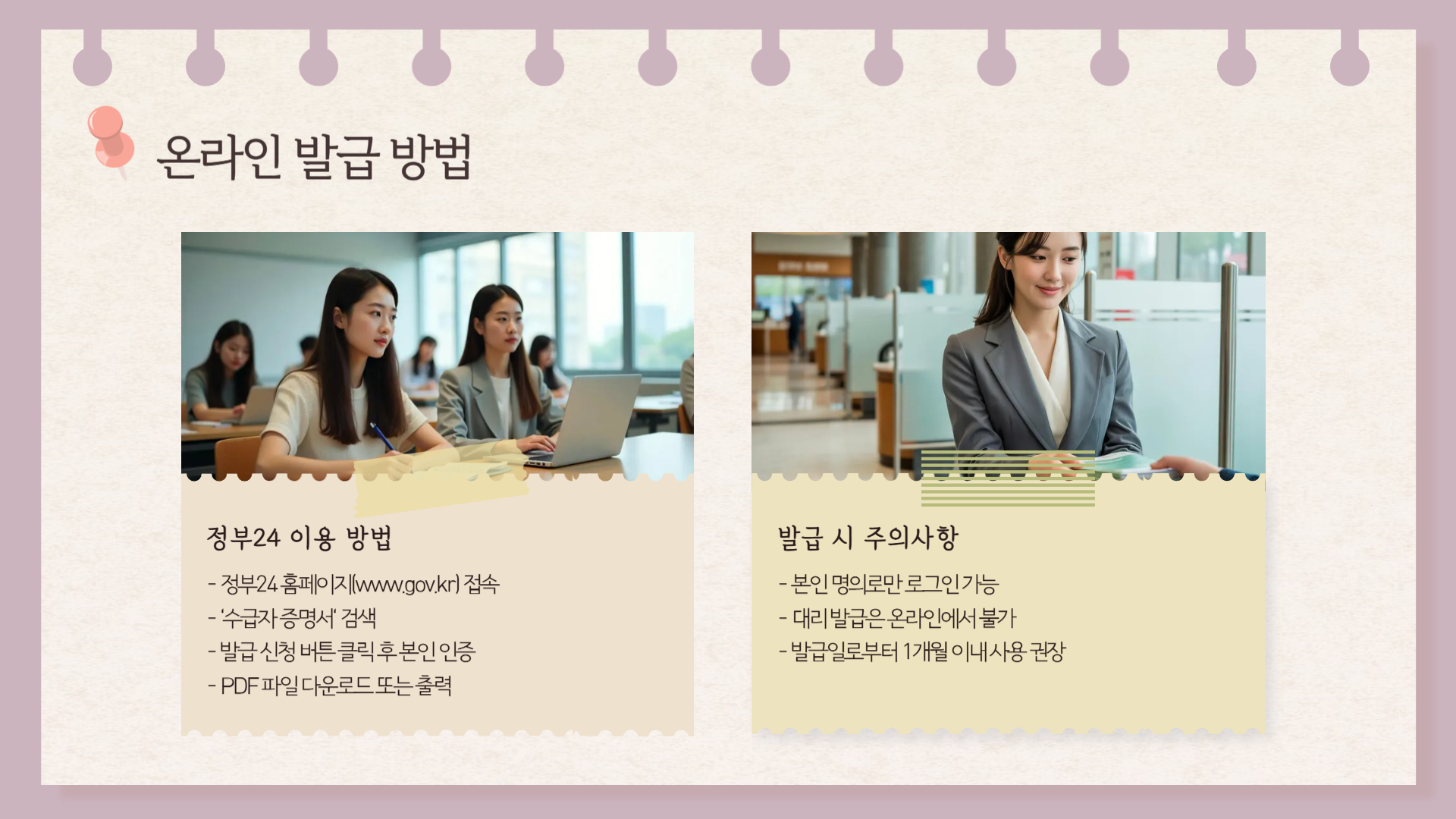- 발급 신청 → PDF 파일 다운로드 또는 출력