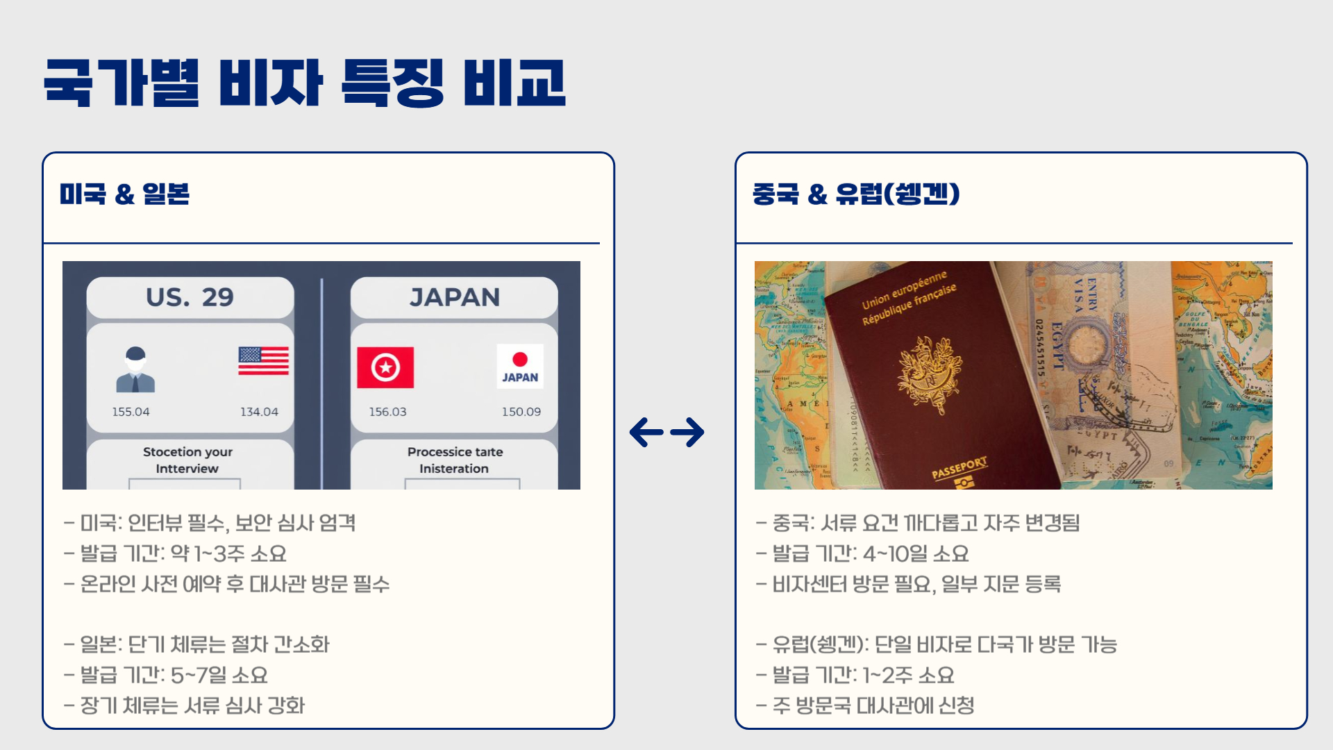 | 유럽 (쉥겐) | 단기 쉥겐비자 → 다수국가 통합 | 1~2주 | 대사관 or 비자센터 |