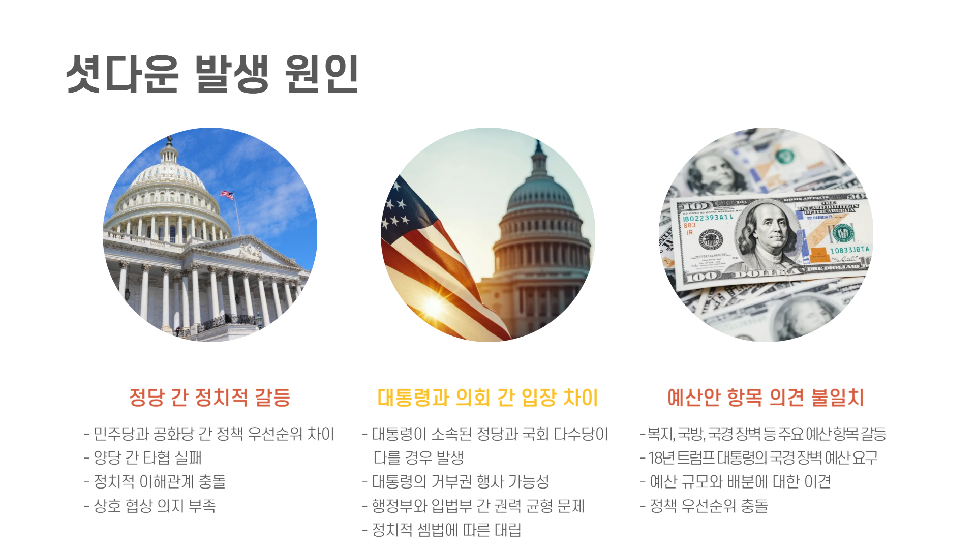 예를 들어, 대통령이 소속된 정당과 국회의 다수당이 다를 경우, 예산안 항목(복지, 국방, 국경 장벽 등)에 대해 서로 다른 입장을 취하면서 합의에 도달하지 못할 수 있습니다. 이로 인해 미국은 수년간 반복적으로 셧다운 사태를 겪어왔습니다.