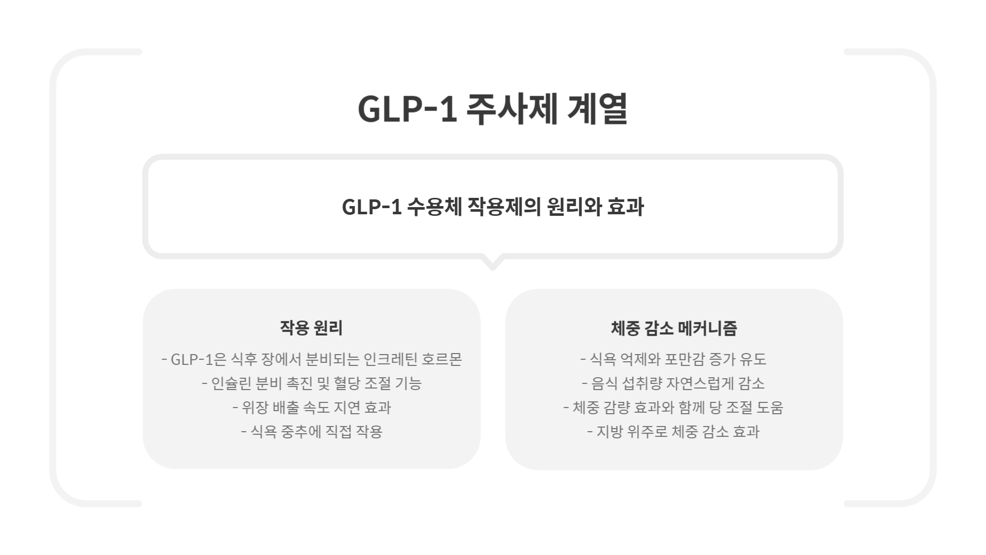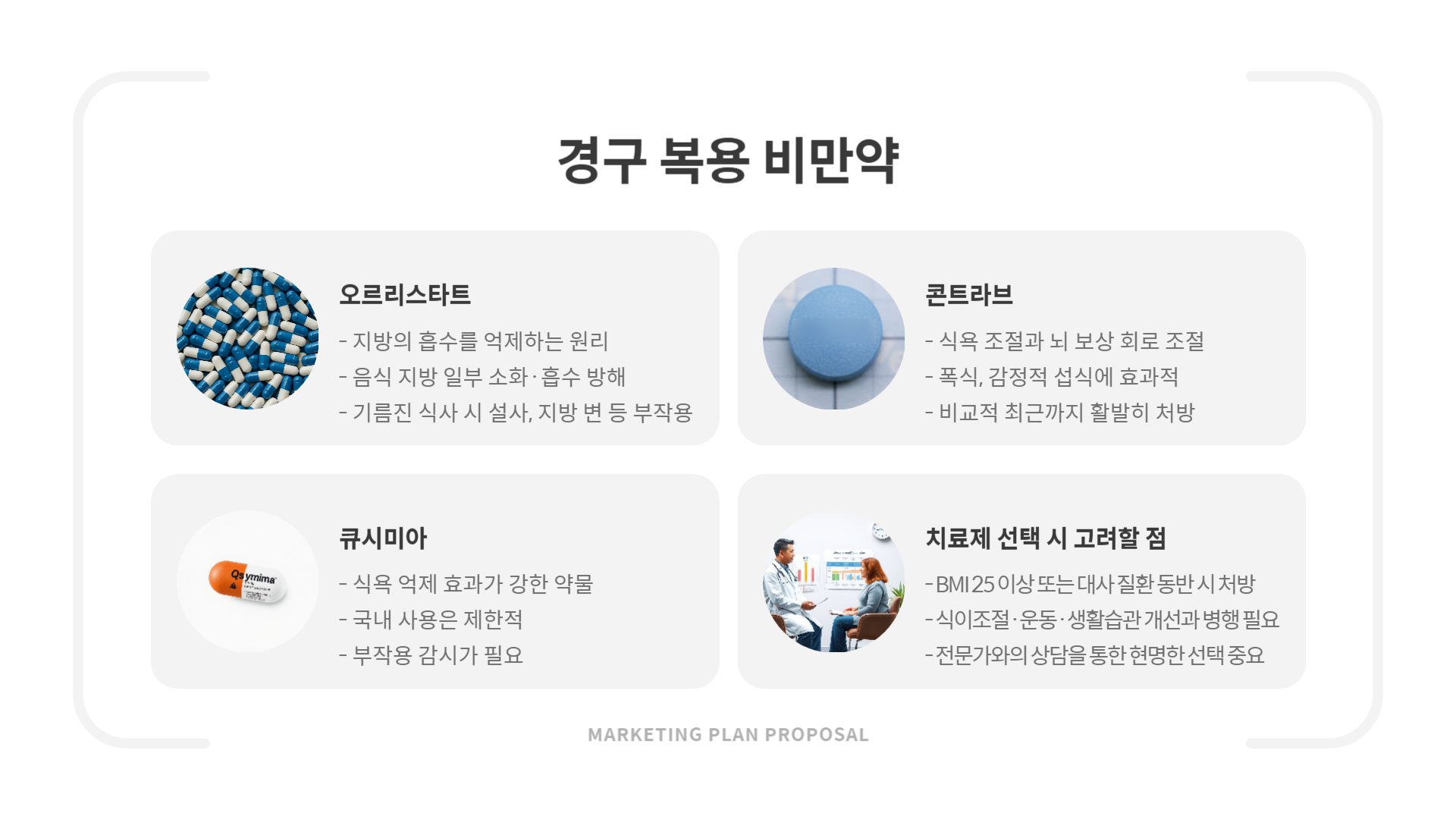 - 경구제(오르리스타트, 콘트라브)는 주사제 대안으로 활용 가능하며, 상대적으로 접근이 쉽습니다.