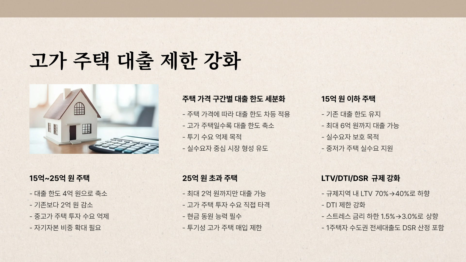 | 주담대 한도 제한 | 15억 이하 주택은 최대 6억 유지 / 15억 초과 ~ 25억 이하 주택은 최대 4억까지 / 25억 초과 주택은 최대 2억까지 허용 | 규제지역 + 수도권 중심 적용 |