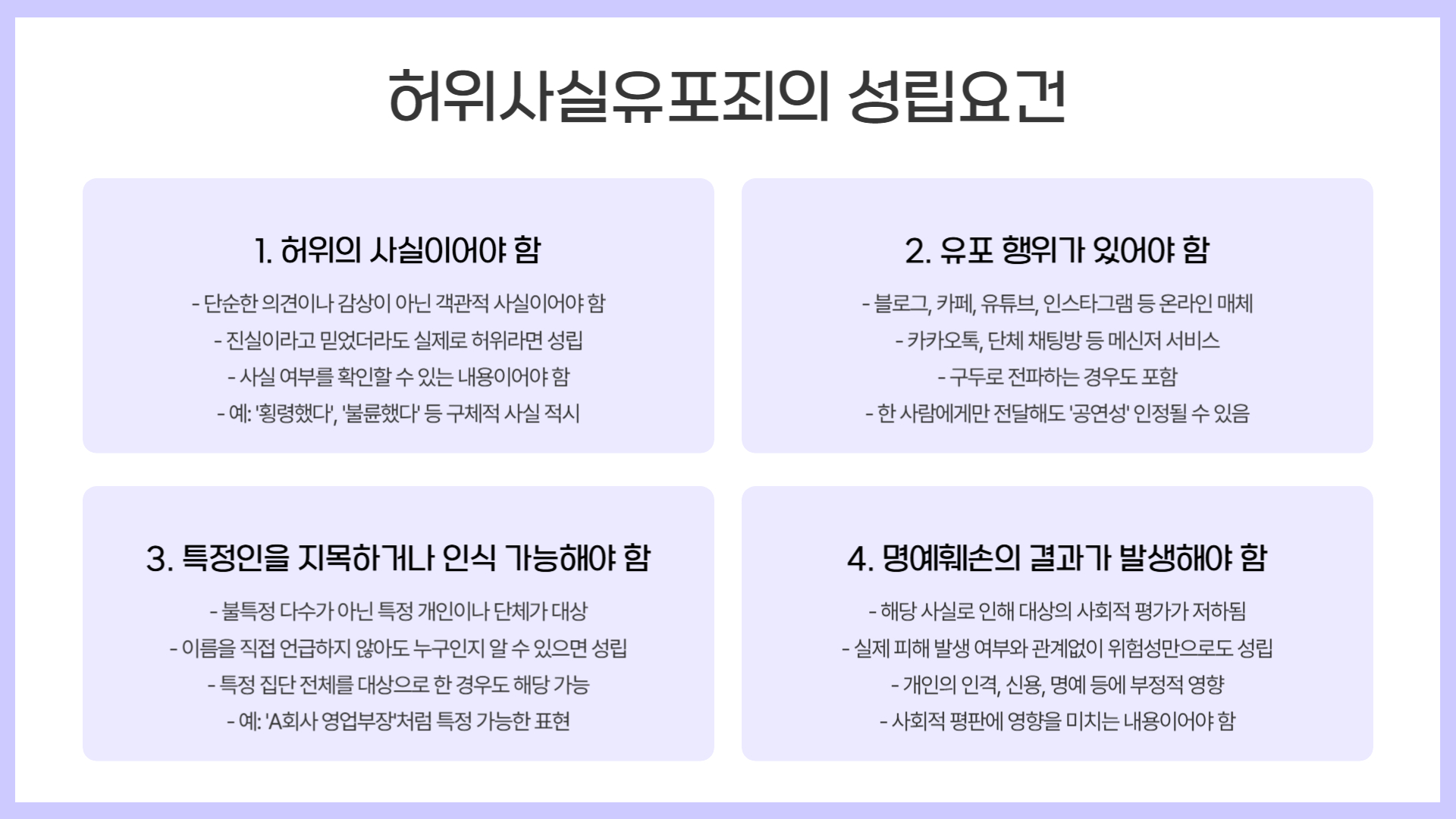 - 단순한 의견이 아니라 객관적으로 입증 가능한 '사실'이 허위일 때 성립됩니다.