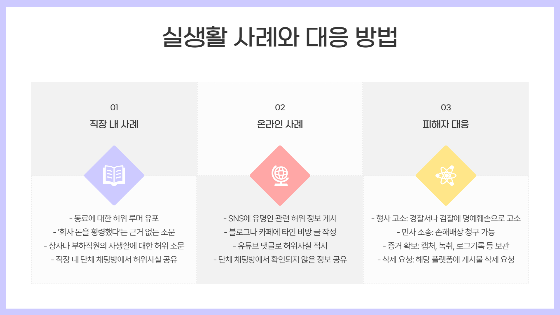 - 단체 채팅방에서 근거 없는 음해성 발언을 공유하는 경우도 처벌 대상이 됩니다.