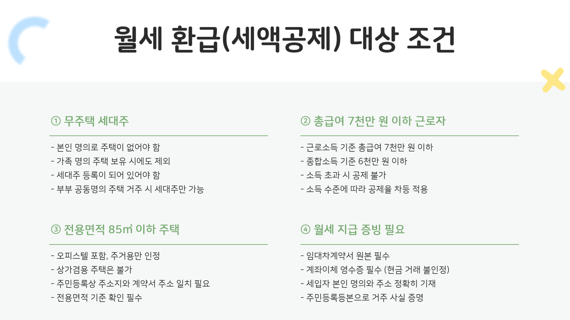 다음 네 가지 요건을 모두 충족해야 월세 환급 대상이 됩니다.