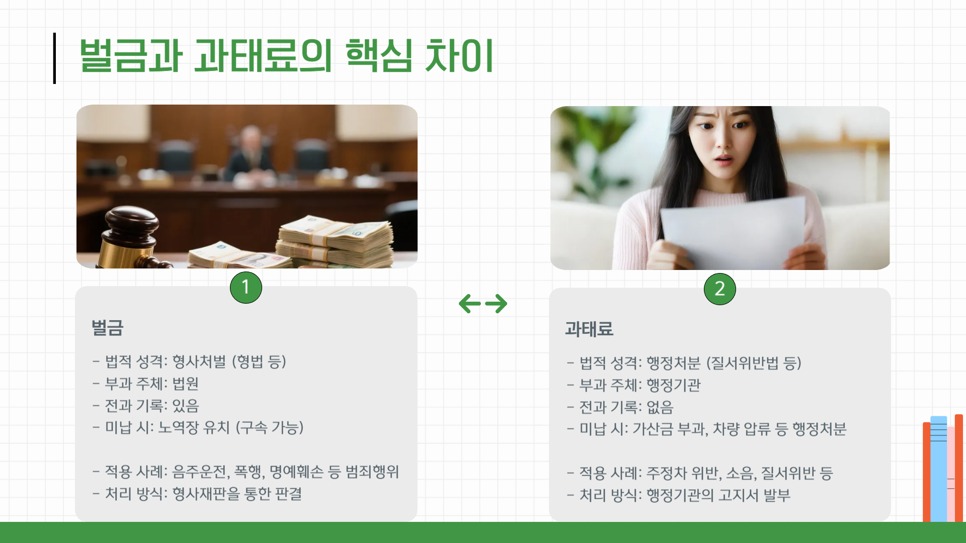 ‘벌금’과 ‘과태료’. 일상생활 속에서 흔히 접하는 단어들이지만, 실제로 두 개념의 차이를 정확히 알고 있는 사람은 많지 않습니다. 특히 교통위반, 공공질서 위반, 각종 신고나 민원과 관련된 상황에서 이 두 단어는 혼용되기 쉽고, 잘못된 정보로 인해 불이익을 당하는 경우도 적지 않죠. 이번에는 헷갈리기 쉬운 ‘벌금’과 ‘과태료’의 법적 의미, 부과 주체, 납부 방식, 전과 여부, 미납 시 조치 등 실질적으로 도움이 되는 핵심 정보들을 구체적으로 비교해 드리겠습니다. 지금부터 차근차근 읽고 정확하게 이해해두면, 혹시 모를 상황에서 침착하게 대처할 수 있을 것입니다.