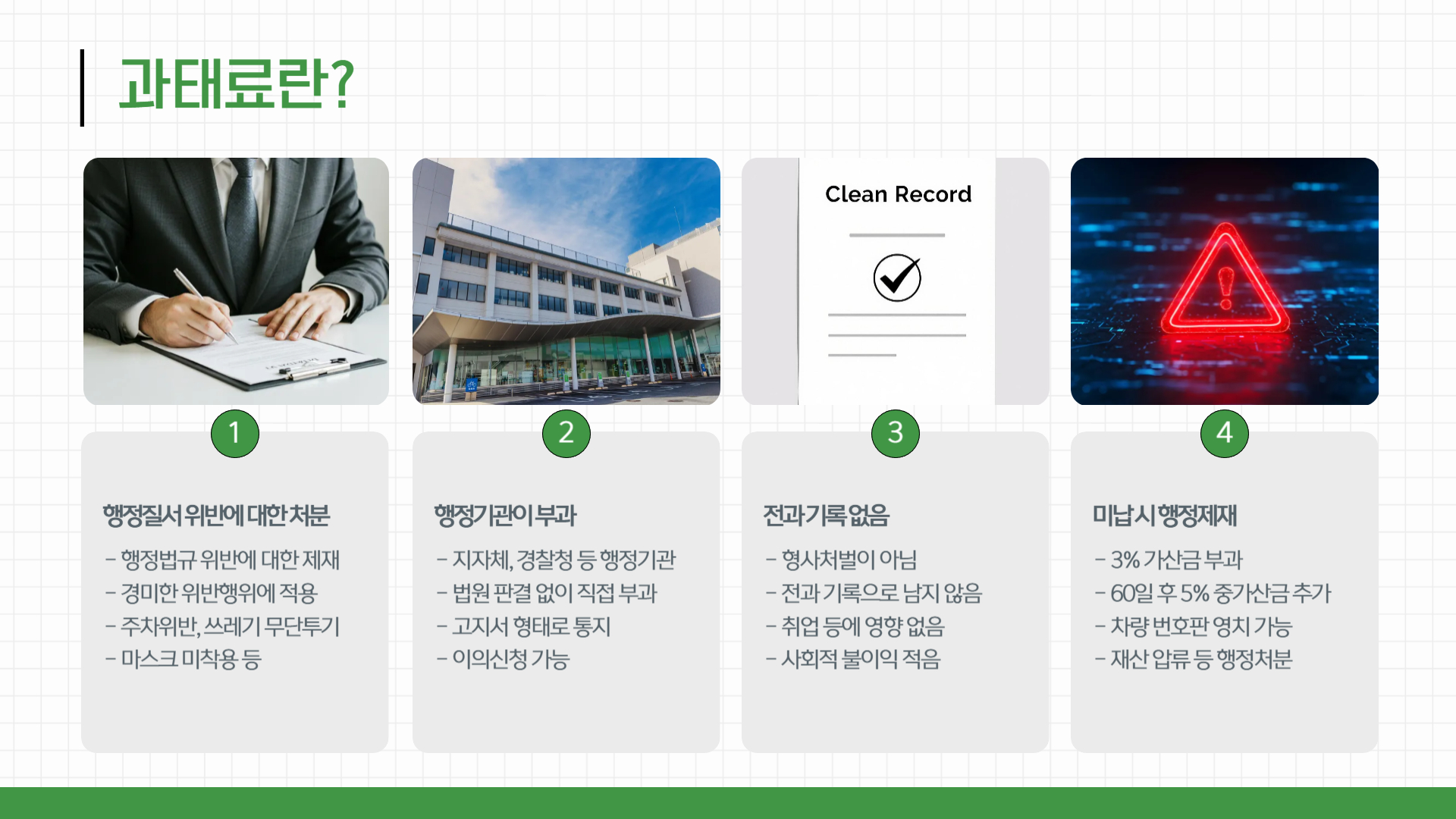 과태료는 행정질서 위반에 대한 행정처분입니다. 법원 판결 없이 행정기관이 부과하며, 전과 기록도 남지 않습니다. 주로 주차위반, 쓰레기 무단투기, 마스크 미착용 등 경미한 위반 행위에 적용됩니다.