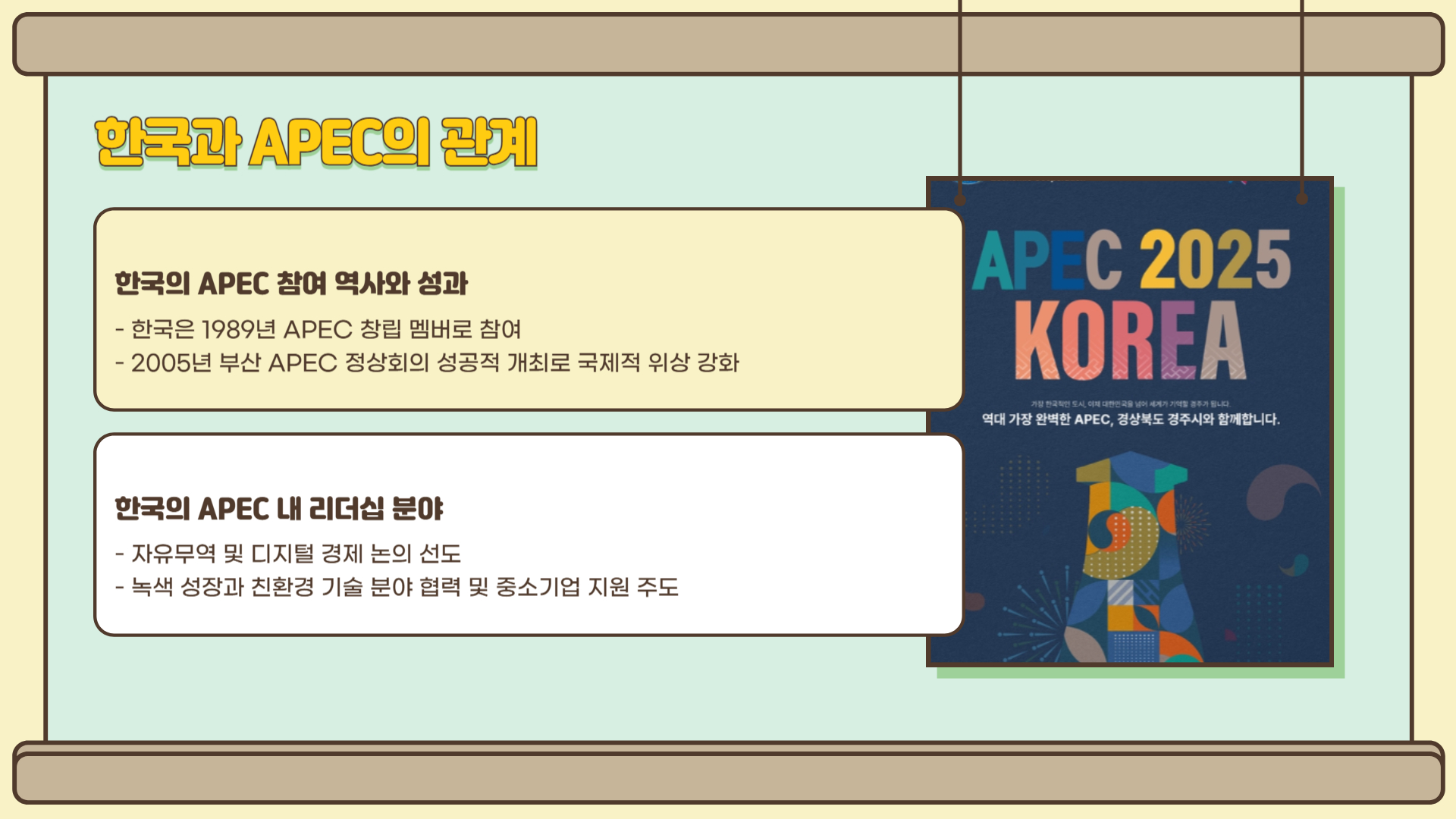 한국은 APEC 창립 멤버 중 하나로, 1989년부터 꾸준히 활동해 왔습니다. 특히 2005년 부산 APEC 정상회의를 성공적으로 개최하였으며, 2025년 경주에서 개최된다. 회원국 간 신뢰와 협력의 상징적 역할을 맡았습니다. 한국은 APEC 내에서