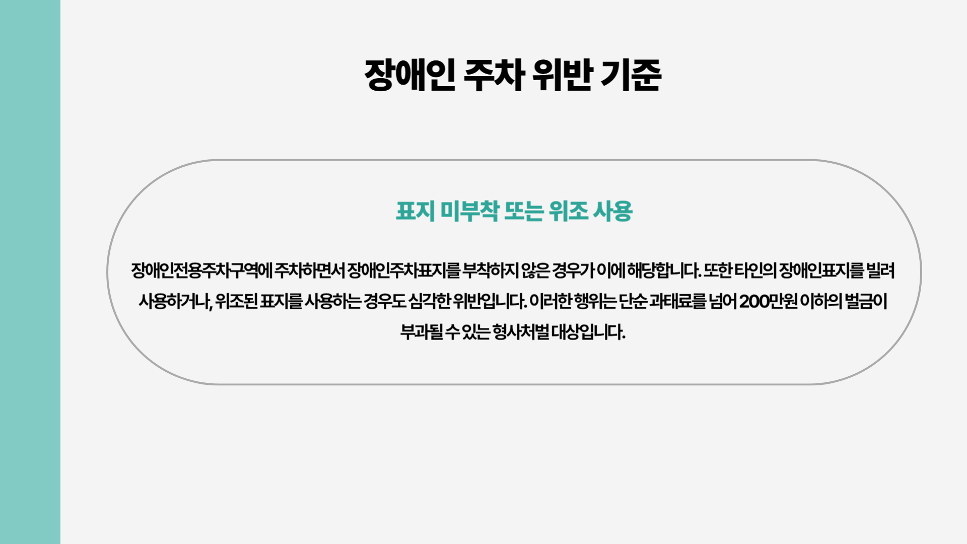 - 타인의 장애인표지를 빌려 사용하거나, 위조된 표지를 사용하는 경우 역시 위반입니다.