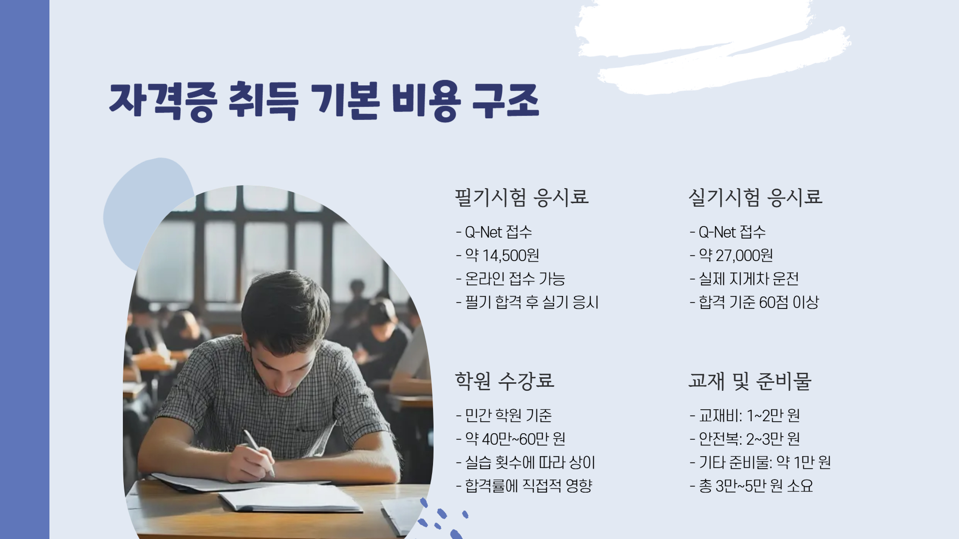 지게차 자격증은 한국산업인력공단(Q-Net)에서 시행하는 국가기술자격으로, 필기시험과 실기시험을 모두 통과해야 취득할 수 있습니다. 준비 과정에서 드는 평균 비용은 다음과 같습니다.