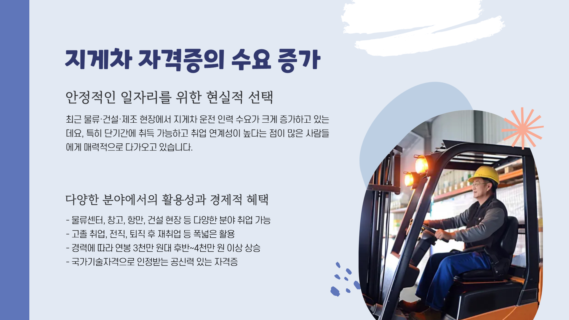 특히 단기간에 취득 가능하고 취업 연계성이 높다는 점이 매력입니다. 자격증 취득 후에는 물류센터, 창고, 항만, 건설 현장 등 다양한 분야에서 즉시 활용할 수 있으며, 경력에 따라 연봉이 3천만 원대 후반~4천만 원 이상으로 상승하기도 합니다.