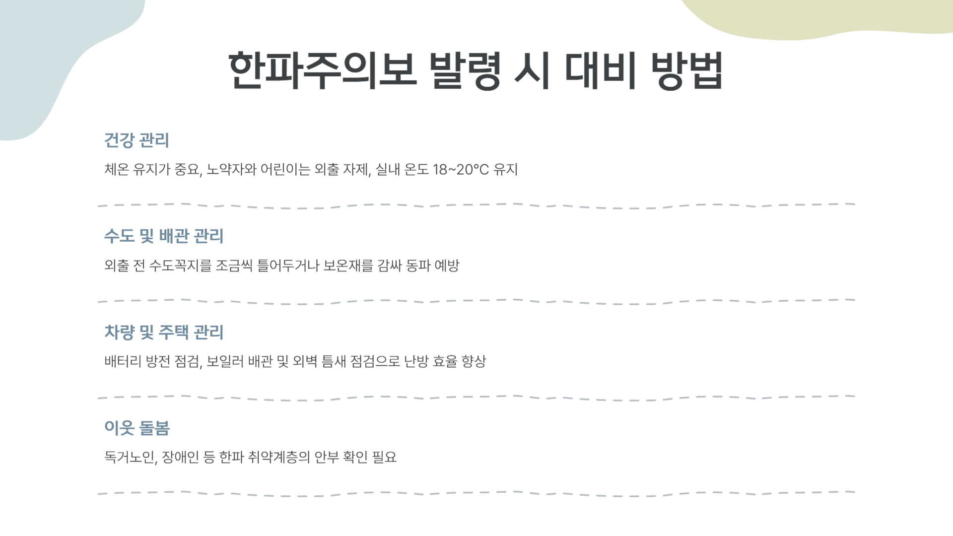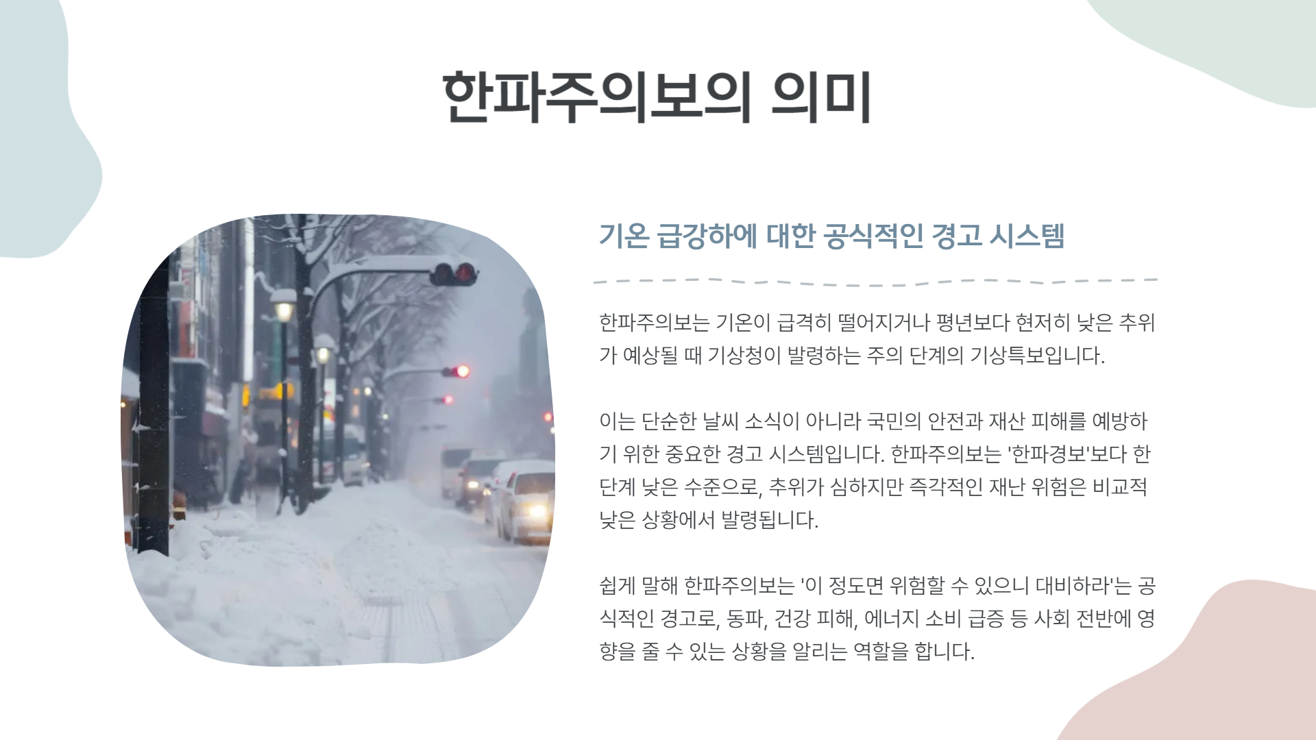 한파주의보는 단순히 날씨가 추워진다는 신호가 아니라, 우리 생활 전반의 안전을 지키기 위한 중요한 경고 시스템입니다.