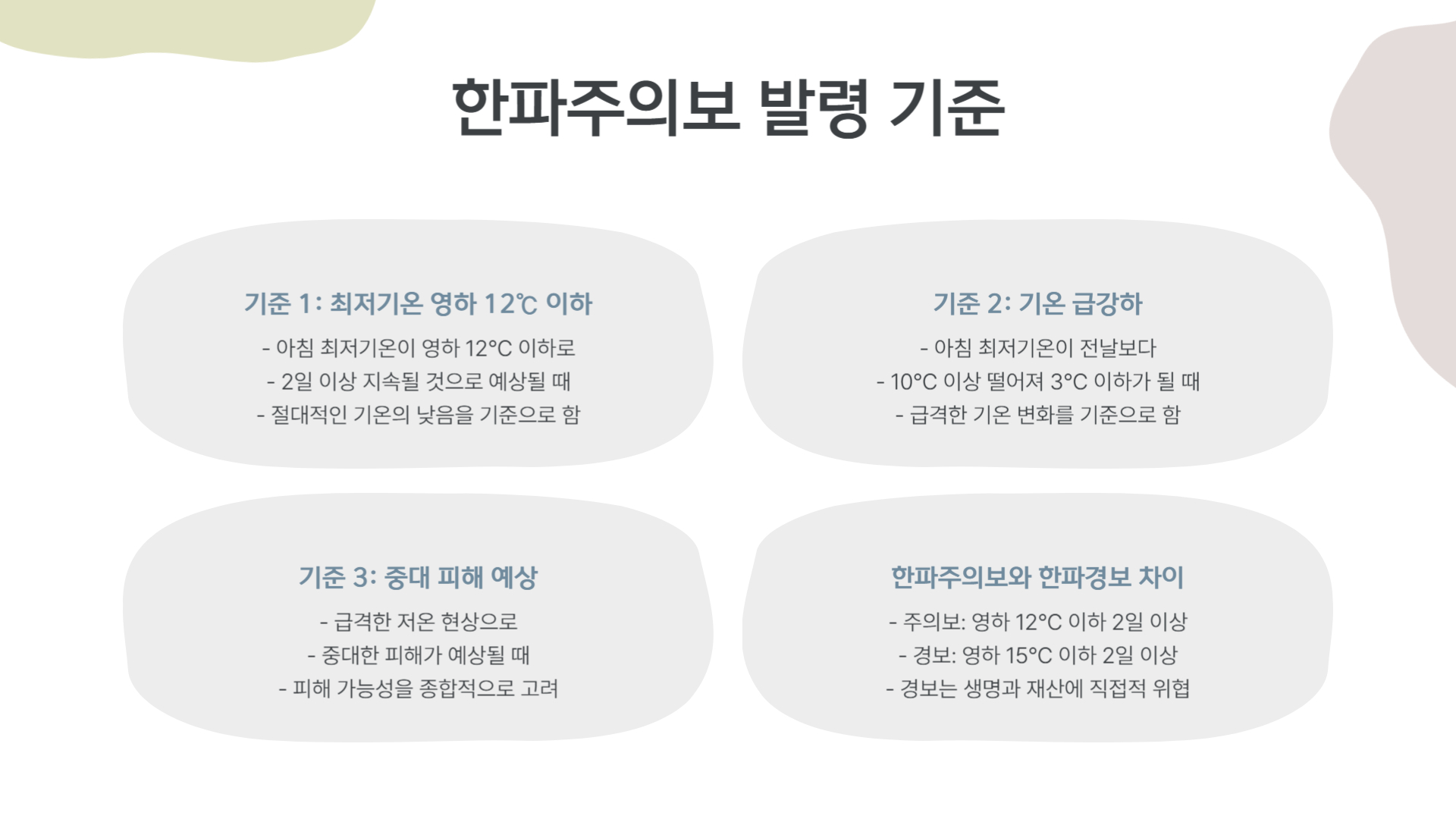즉, 단순히 “춥다”는 이유만으로 발령되는 것이 아니라, 기온의 절대적인 낮음 + 급격한 기온 하강 + 피해 가능성을 종합적으로 고려하여 결정됩니다.