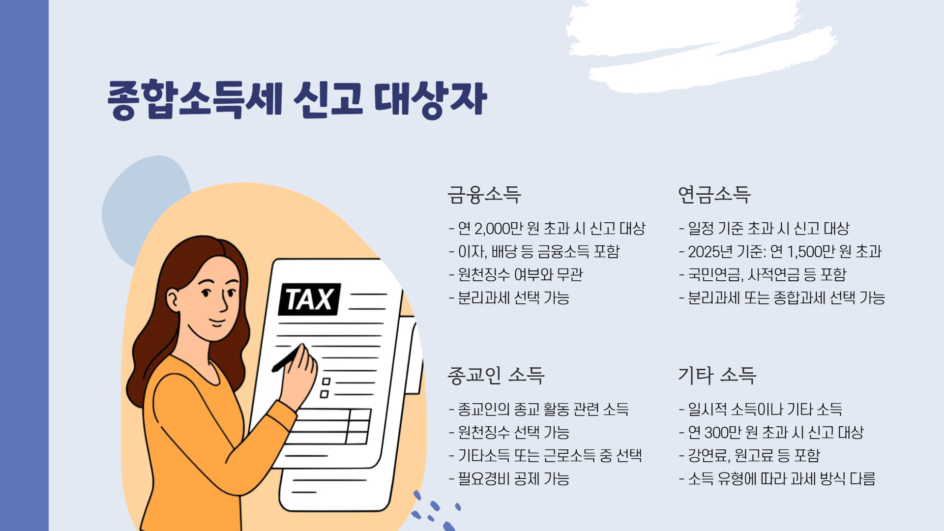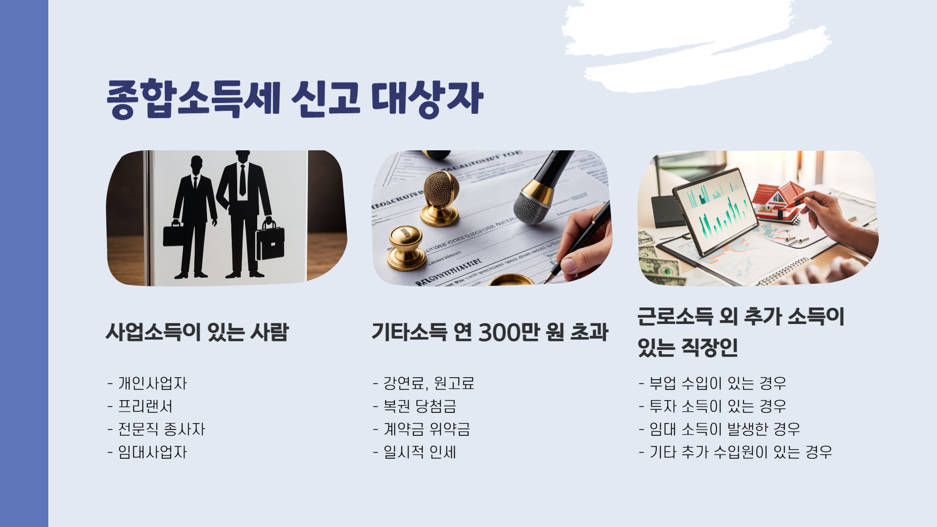 국세청은 다음과 같은 경우를 종합소득세 신고 대상자로 분류합니다.