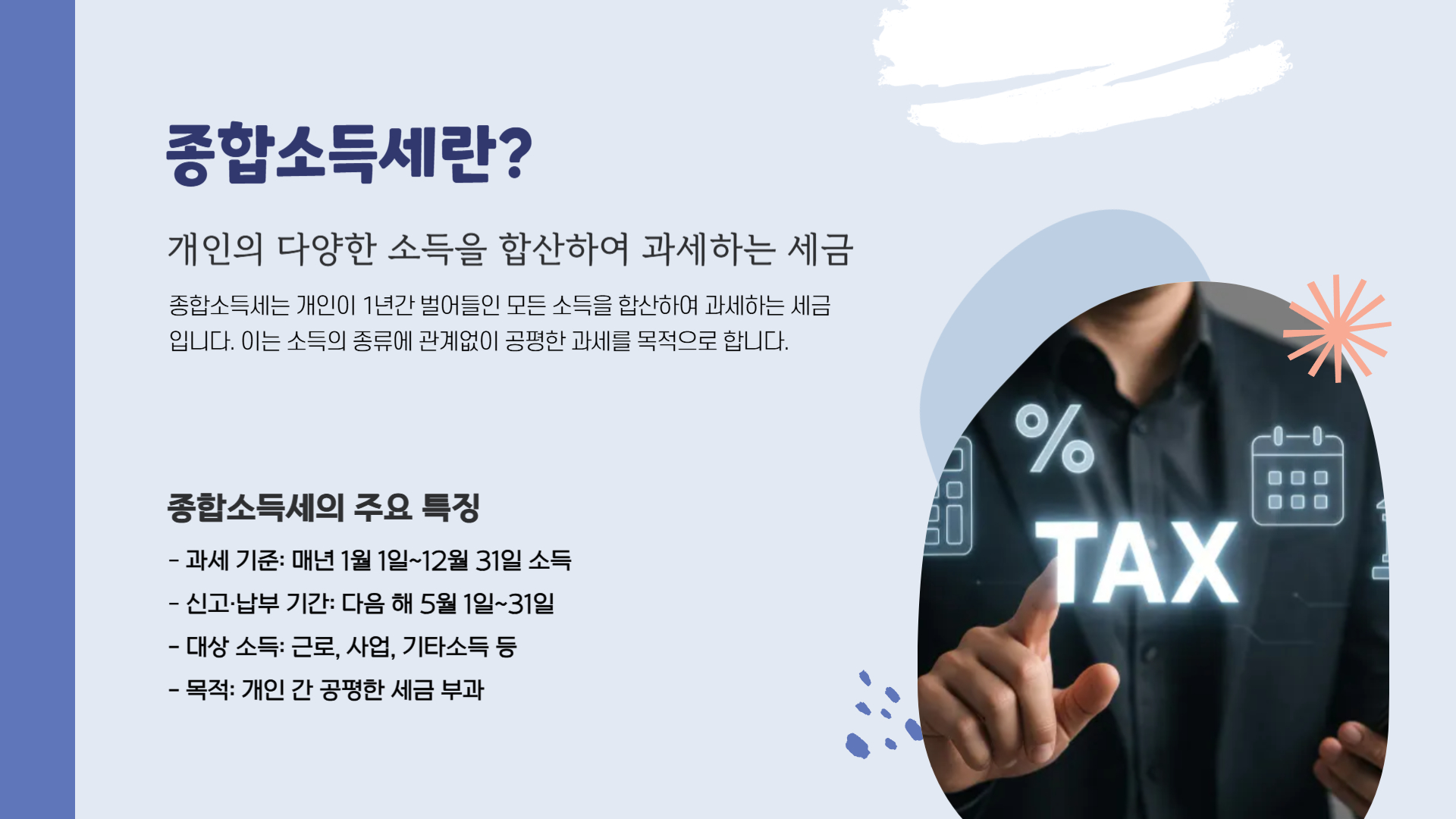 종합소득세는 개인이 벌어들인 다양한 종류의 소득(근로소득, 사업소득, 기타소득 등)을 한데 모아 과세하는 세금입니다. 매년 1월 1일부터 12월 31일까지의 소득을 기준으로, 다음 해 5월 1일~31일 사이에 신고·납부해야 합니다.