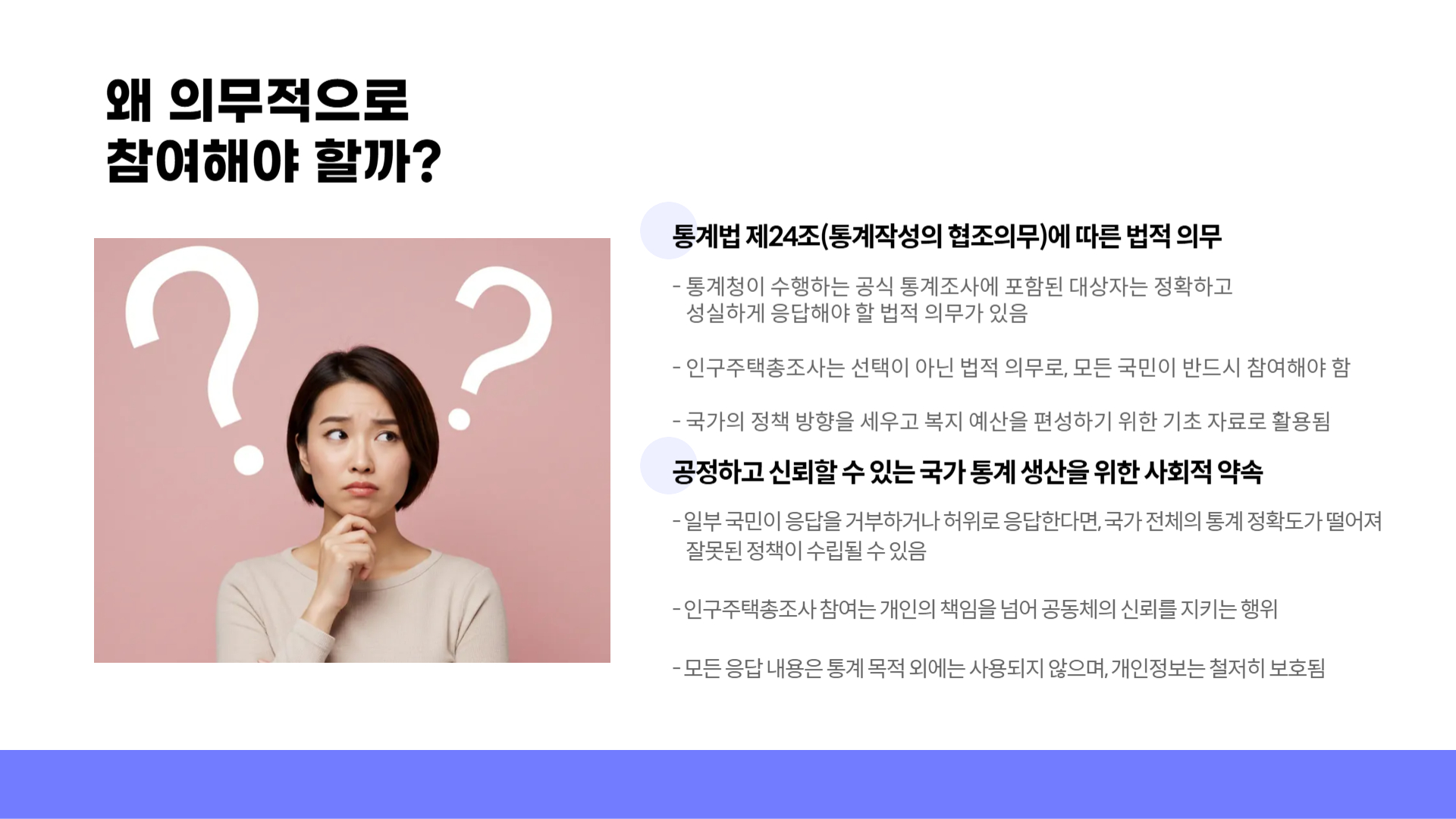 따라서 조사에 성실히 참여하는 것은 국민으로서의 책임이자, 나의 일상이 더 나은 방향으로 바뀌길 바라는 권리의 실천입니다.