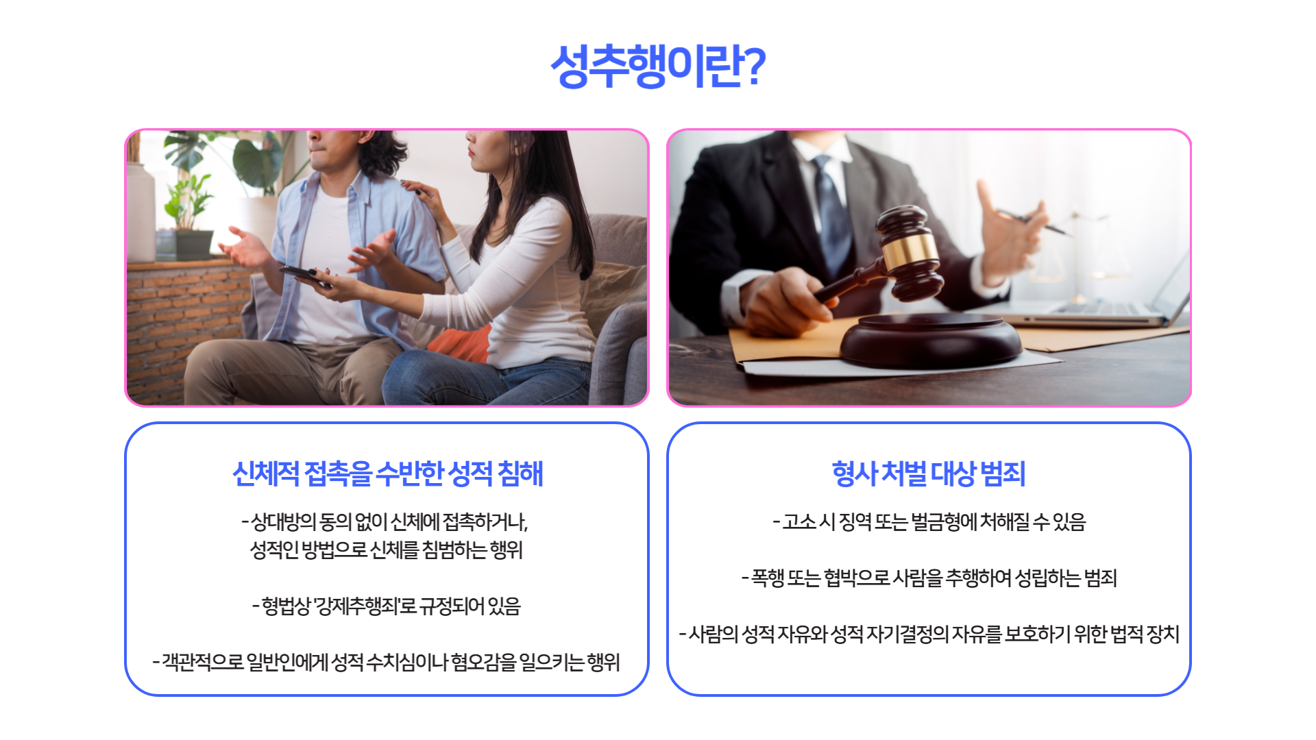 많은 사람이 "그게 성추행이야? 그냥 장난 아니었어?"라며 가해를 정당화하거나, 반대로 피해자가 침묵하게 되는 경우가 많습니다. 하지만 정확한 개념 이해는 피해자의 권리 보호, 가해자 처벌, 조직 내 예방교육에 있어 매우 중요합니다.