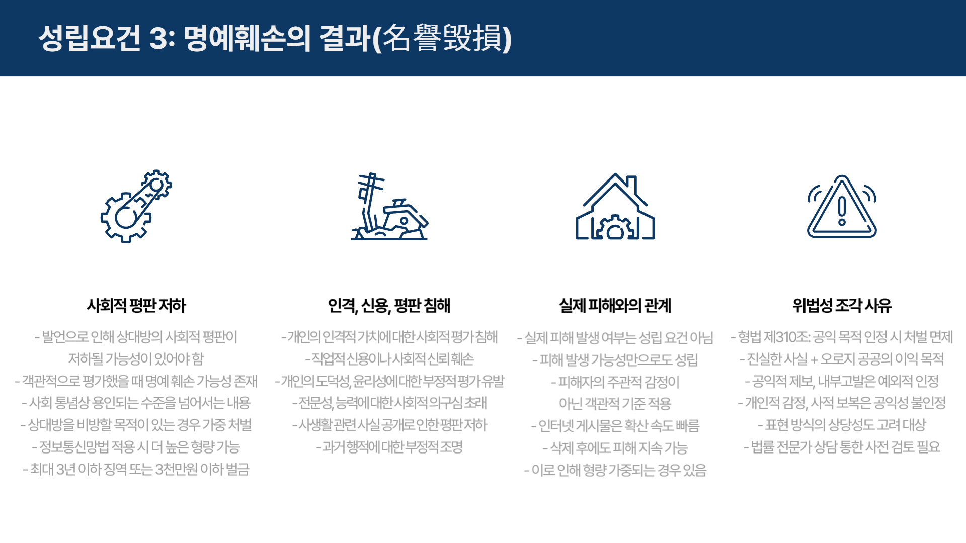 - 타인의 인격, 신용, 평판을 해치는 내용이면 성립 가능성이 높습니다.
