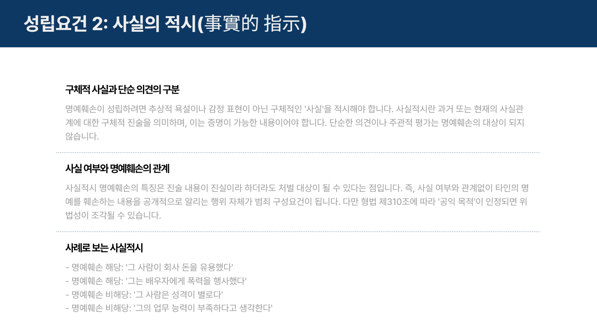- 명예훼손이 성립하려면 추상적 욕설이 아닌 구체적인 ‘사실’을 적시해야 합니다.