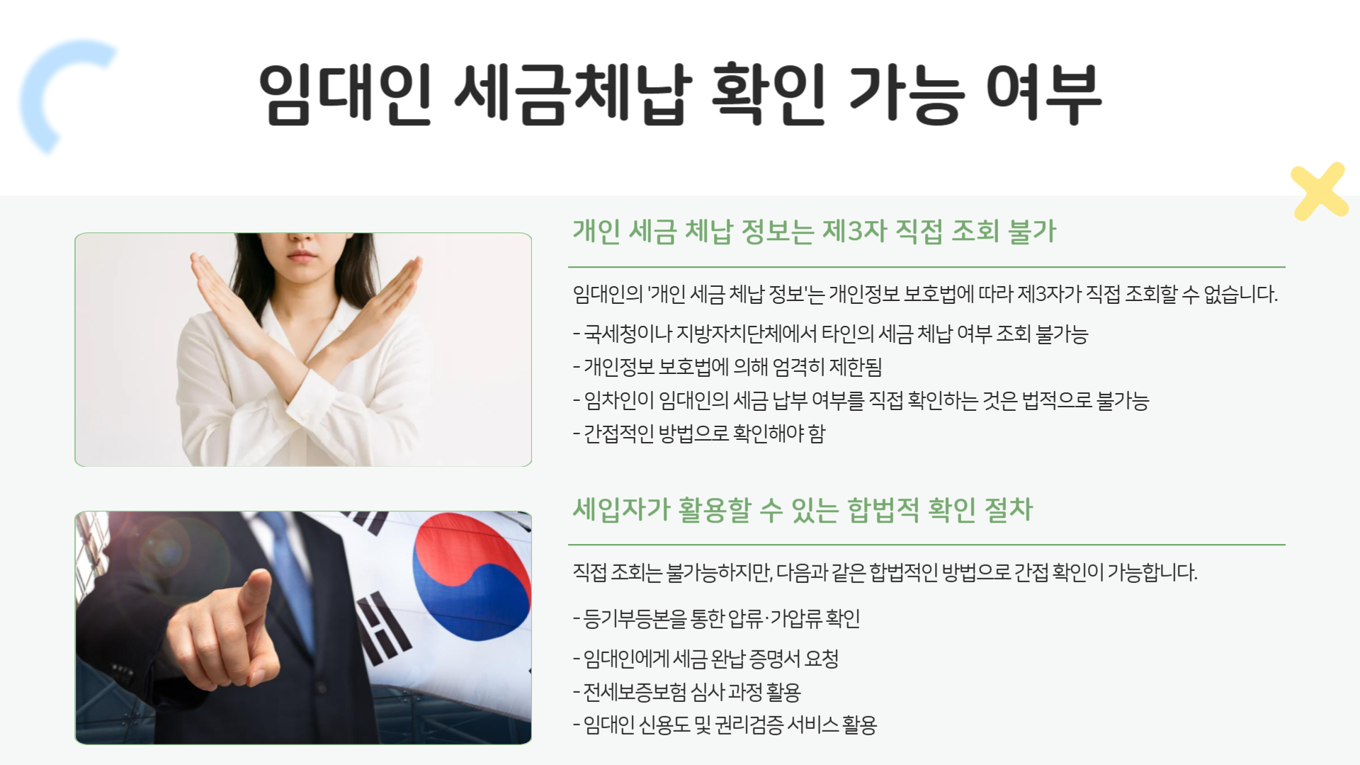 따라서 세입자가 직접 국세청 또는 지방자치단체에서 임대인의 체납 여부를 조회하는 것은 불가능합니다.