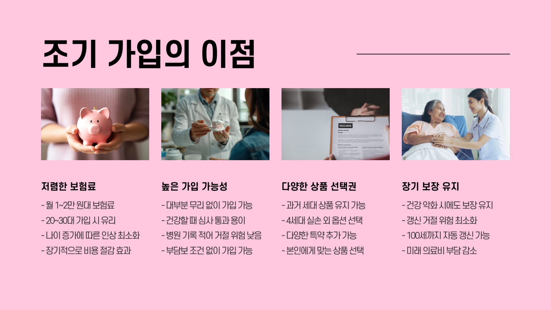 - 조기 가입자는 저렴한 보험료로 장기간 보장