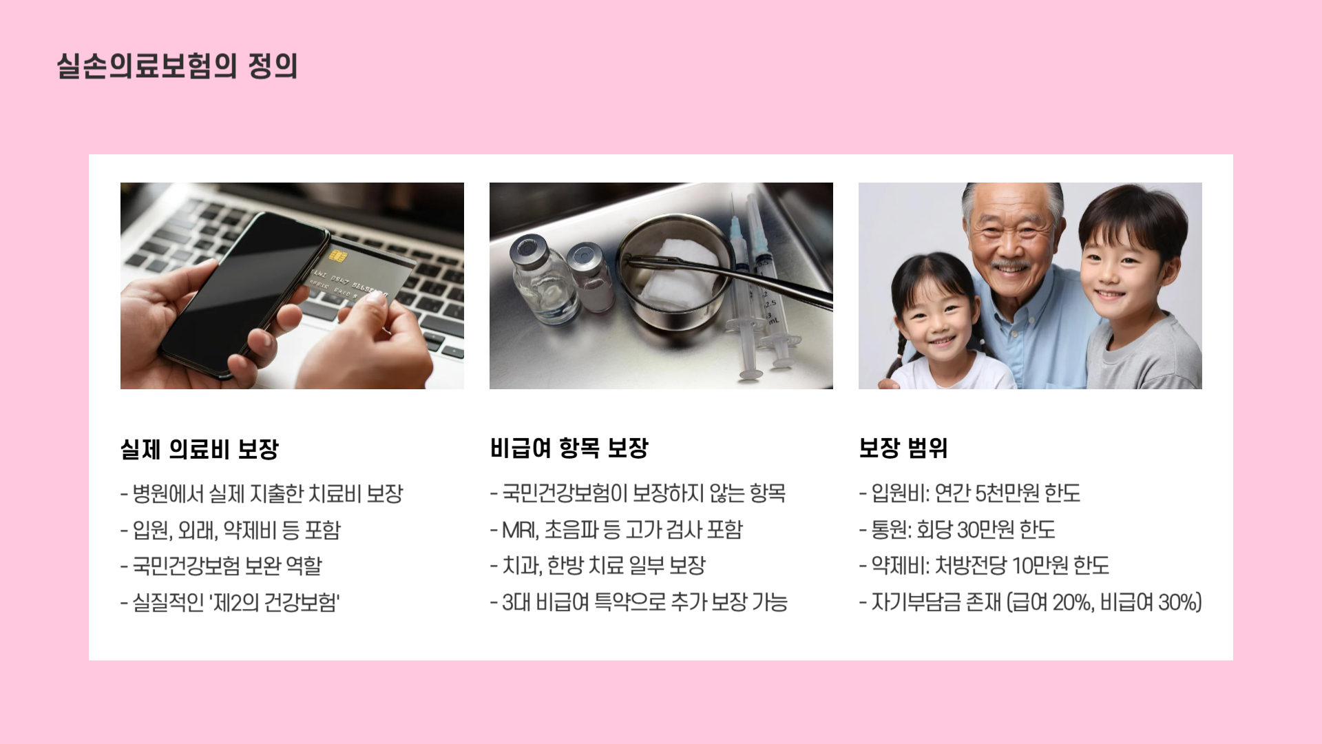 입원, 외래, 약제비 등을 중심으로 보장하며, 국민건강보험으로 부족한 비급여 치료비까지 일부 보장합니다.