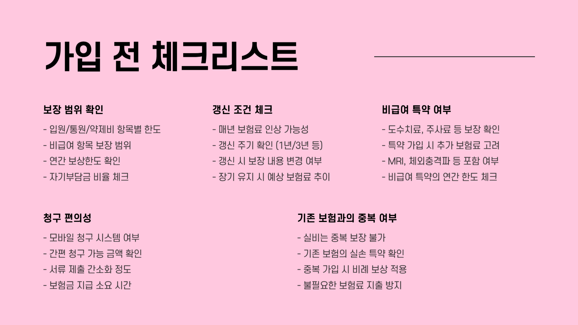 - 갱신 거절 가능성: 장기 입원·질병 사용률이 높아지면 갱신 거절되는 경우도 있음