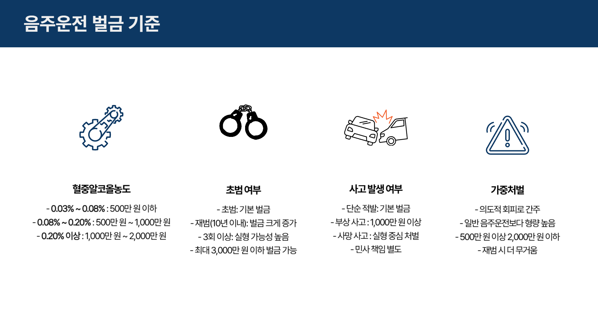 이처럼 음주운전 벌금은 단순한 고정금액이 아니라, 상황에 따라 수백만 원에서 수천만 원까지 차이가 발생합니다.